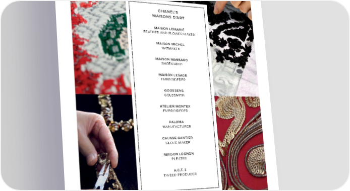 CHANEL’S MAISONS D’ART MAISON LEMARIÉ FEATHER AND FLOWER MAKER MAISON MICHEL HATMAKER MAISON MASSARO SHOEMAKER MAISON LESAGE EMBROIDERER GOOSSENS GOLDSMITH ATELIER MONTEX EMBROIDERER PALOMA MANUFACTURER CAUSSE GANTIER GLOVE MAKER MAISON LOGNON PLEATER A.C.T. 3 TWEED PRODUCER