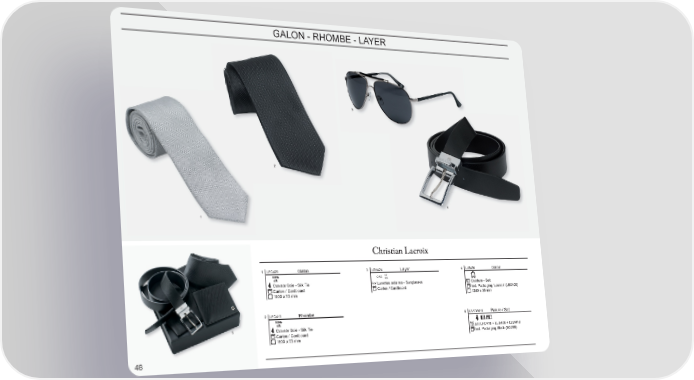 GALON - RHOMBE - LAYER 3 2 4 1 1 LFC426 Galon 3 LGN424 Layer 4 LLB426 Galon CAT.3 UV 400 Cravate Soie - Silk Tie Lunettes solaires - Sunglasses Ceinture - Belt Carton / Cardboard Carton / Cardboard Incl. Packaging ‘Lacroix’ (LBX400) 1500 x 70 mm 1250 x 35 mm 2 LFC418 Rhombe 5 LPATW418 Parure / Set 5 Cravate Soie - Silk Tie Set LFC418 + LLB426 + LLW418 Carton / Cardboard Incl. Packaging Black (BG299) 1500 x 70 mm 48