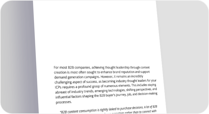 Conclusion For most B2Bcompanies,achievingthoughtleadershipthroughcontent creation is most often sought to enhance brand reputation and support demandgenerationcampaigns.However,itremainsanincredibly challenging aspect of success, as becoming industry thought leaders for your ICPs requires a profound grasp of numerous elements. This includes staying abreast of industry trends, emerging technologies, shifting perspectives, and influential factors shaping the B2B buyer's journey, job, and decision-making processes. "B2Bcontentconsumptionistightly linked to purchase decisions. A lot of B2B content is weak. It’s written to please executives rather than to connect with buyers. Content goes stale. Things change faster and faster, so new content has to bedevelopedtostayfresh." - Forbes, commenting on the recent 2023 State of B2BContentConsumption&DemandReport. 8