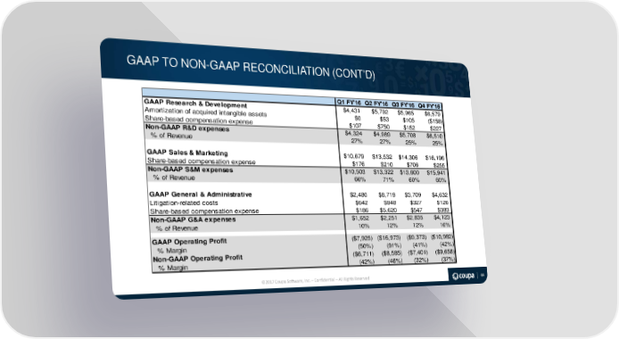 GAAP TO NON-GAAP RECONCILIATION (CONT’D) Q1 FY'16 Q2 FY'16 Q3 FY'16 Q4 FY'16 GAAP Research & Development $4,431 $5,792 $5,965 $6,579 Amortization of acquired intangible assets $0 $53 $105 ($158) Share-based compensation expense $107 $750 $152 $227 Non-GAAP R&D expenses $4,324 $4,989 $5,708 $6,510 % of Revenue 27% 27% 25% 25% GAAP Sales & Marketing $10,679 $13,532 $14,306 $16,196 Share-based compensation expense $176 $210 $706 $255 Non-GAAP S&M expenses $10,503 $13,322 $13,600 $15,941 % of Revenue 66% 71% 60% 60% GAAP General & Administrative $2,480 $8,719 $3,709 $4,632 Litigation-related costs $642 $848 $327 $126 Share-based compensation expense $186 $5,620 $547 $383 Non-GAAP G&A expenses $1,652 $2,251 $2,835 $4,123 % of Revenue 10% 12% 12% 16% GAAP Operating Profit ($7,925) ($16,973) ($9,373) ($10,982) % Margin (50%) (91%) (41%) (42%) Non-GAAP Operating Profit ($6,711) ($8,585) ($7,401) ($9,658) % Margin (42%) (46%) (32%) (37%) ©2017 Coupa Software, Inc. – Confidential – All Rights Reserved 44