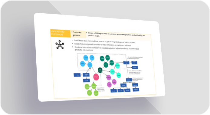 UNDERSTAND • Customer • Createa360-degreeviewofcustomeracrossdemographics,productholdingand CUSTOMERS genome productusage. Consolidatedatafrommultiplesourcestogetanintegratedviewofeverycustomer Createfeatures/derivedvariablestomakeinferences oncustomersbehavior Createaninteractivedashboardtovisualizecustomerbehaviorandviewrecommended products, interventions Age Balance Transaction Merchant Attribute Income Info s Demo Assets Transaction Location Prod Holding Liabilities Index Usage CUSTOMER Investments Usage Website Channel Product Merchant Up-Sell Cross-Sell Interest nt ATM Branch