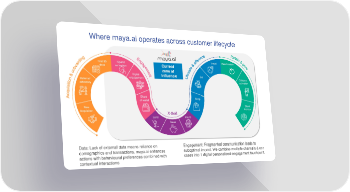 Where maya.ai operates across customer lifecycle First 90 Spend Travel Reactivation days activation Current zone of Digital influence Eat Referral/ engagement Category advocacy activation Share Shop of wallet New Silent Acquisition Attrition Lend Insure Save Data: Lack of external data means reliance on Engagement: Fragmented communication leads to demographics and transactions. maya.ai enhances suboptimal impact. We combine multiple channels & use actions with behavioural preferences combined with cases into 1 digital personalised engagement touchpoint. contextual interactions