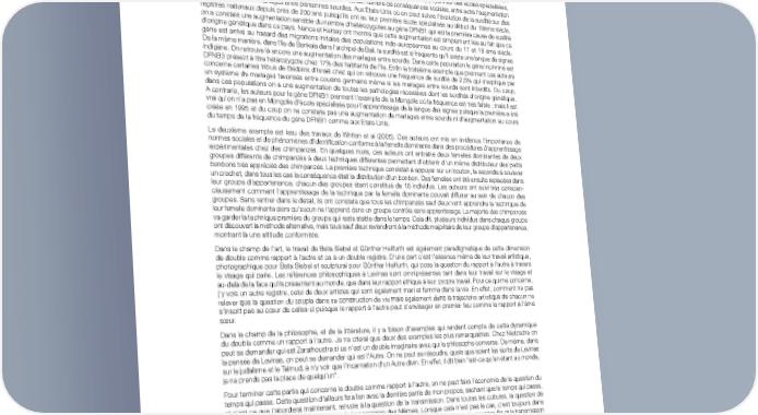 DAVID COHEN ///// CONFÉRENCE “LE DOUBLE” On peut également rappeler les délires d'incarnation animale comme par exemple les délires lycanthropiques où le sujet a la conviction délirante qu'il s'est transformé en loup ce qui peut le conduire à déambuler à quatre pattes en aboyant. Là encore ces formes délirantes qui sont rares se voient essentiellement dans les délires schizophréniques. Venons en maintenant à l'idée du double qui rend compte de son rapport à l'Autre. Nous l'aborderons avec la même idée de prendre des exemples variés issus de l'art, des sciences et de la psychopathologie. Pour plus de clarté, je distinguerai les champs social et culturel d'une part, des questionnements philosophiques, c'est-à-dire du double dans son rapport à l'autre quant à leurs humanités respectives. Pour rendre compte dans la littérature scientifique comment intervient au plan social la notion de double c'est-à-dire de Même identitaire au plan des relations sociales, je prendrai deux exemples très différents. Le premier est résumé dans les travaux de Nance et Kersey qui se sont intéressés à la fréquence et l'évolution au cours du temps des surdités d'origine génétique. L'existence d'une culture sourde s'appuyant sur des écoles spécialisées, l'utilisation d'une langue des signes propre, comporte un certain nombre de conséquences sociales, entre autre l'augmentation de la fréquence des mariages entre personnes sourdes. Aux Etats-Unis où on peut suivre l'évolution de la surdité sur des registres nationaux depuis près de 200 ans puisqu'ils ont eu leur première école spécialisée au début du 19ème siècle, on a constaté une augmentation sensible du nombre d'hétérozygotes au gène DFNB1 qui est la première cause de surdité d'origine génétique dans ce pays. Nance et Kersey ont montré que cette augmentation est simplement liée au fait que ce gène est arrivé au hasard des migrations initiales des populations indo-européennes au cours du 17 et 18 ème siècle. De la même manière, dans l'île de Benkala dans l'archipel de Bali, la surdité est si fréquente qu'il existe une langue de signes indigène. On retrouve là encore une augmentation des mariages entre sourds. Dans cette population le gène incriminé est DFNB3 présent à titre hétérozygote chez 17% des habitants de l'île. Enfin le troisième exemple que prennent ces auteurs concerne certaines tribus de Bédoins d'Israël chez qui on retrouve une fréquence de surdité de 2,6% qui s'explique par un système de mariages favorisés entre cousins germains même si les mariages entre sourds sont interdits. Du coup, dans ces populations on a une augmentation de toutes les pathologies récessives dont les surdités d'origine génétique. A contrario, les auteurs pour le gène DFNB1 prennent l'exemple de la Mongolie où la fréquence est très faible ; mais il est vrai qu'on n'a pas en Mongolie d'école spécialisée pour l'apprentissage de la langue des signes puisque la première a été créée en 1995 et du coup on ne constate pas une augmentation de mariages entre sourds ni d'augmentation au cours du temps de la fréquence du gène DFNB1 comme aux Etats-Unis. Le deuxième exemple est issu des travaux de Whiten et al (2005). Ces auteurs ont mis en évidence l'importance de normes sociales et de phénomènes d'identification conforme à la femelle dominante dans des procédures d'apprentissage expérimentales chez des chimpanzés. En quelques mots, ces auteurs ont entraîné deux femelles dominantes de deux groupes différents de chimpanzés à deux techniques différentes permettant d'obtenir d'un même distributeur des petits bonbons très appréciés des chimpanzés. La première technique consistait à appuyer sur un bouton, la seconde à soulever un crochet, dans tous les cas la conséquence était la distribution d'un bonbon. Ces femelles ont été ensuite replacées dans leur groupe d'appartenance, chacun des groupes étant constitué de 16 individus. Les auteurs ont suivi très conscien- cieusement comment l'apprentissage de la technique par la femelle dominante pouvait diffuser au sein de chacun des groupes. Sans rentrer dans le détail, ils ont constaté que tous les chimpanzés sauf deux vont apprendre la technique de leur femelle dominante alors qu'aucun ne l'apprend dans un groupe contrôle sans apprentissage. La majorité des chimpanzés va garder la technique première du groupe qui reste stable dans le temps. Cela dit, plusieurs individus dans chaque groupe ont découvert la méthode alternative, mais tous sauf deux reviendront à la méthode majoritaire de leur groupe d'appartenance, montrant là une attitude conformiste. Dans le champ de l'art, le travail de Beta Siebel et Günther Heilfurth est également paradigmatique de cette dimension de double comme rapport à l'autre et ce à un double registre. D'une part c'est l'essence même de leur travail artistique, photographique pour Beta Siebel et sculptural pour Günther Heilfurth, qui pose la question du rapport à l'autre à travers le visage qui parle. Les références philosophiques à Levinas sont omniprésentes tant dans leur travail sur le visage et au-delà de la face qu'ils présentent au monde, que dans leur rapport éthique à leur propre travail. Pour ce qui me concerne, j'y vois un autre registre, celui de deux artistes qui sont également mari et femme dans la vie. En effet, comment ne pas relever que la question du couple dans sa construction de vie mais également dans la trajectoire artistique de chacun ne s'inscrit pas au cœur de celles-ci puisque le rapport à l'autre peut s'envisager en premier lieu comme le rapport à l'âme sœur. Dans le champ de la philosophie, et de la littérature, il y a foison d'exemples qui rendent compte de cette dynamique du double comme un rapport à l'autre. Je ne citerai que deux des exemples les plus remarquables. Chez Nietzsche on peut se demander qui est Zarathous