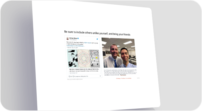 3/10/2018 2018 Design In Tech Report Be sure to include others unlike yourself, and bring your friends Michael Bierut @michaelbierut Very proud to have been invited by @johnmaeda to join a group of great designers for this project fastcodesign.com/90154530/tech-… 11:24 AM - Dec 15, 2017 Tech Has A Diversity Problem–So This Designer Went To Kent… David Gibson, the superintendent of the Paintsville school district, had this idea that John Maeda, the head of Automattic’s design and inclusion progra… the company I'm at, Automattic, which is all remote, that people could be in fastcodesign.com Paintsville and get a full-time job without leaving the area. A lightbulb went off, that David's kids could do that, and live where their families have lived for generations, 310 50 people are talking about this and still have an income and benefits. —Fast Company Source: @michaelbierut @fastcompany 2018 Design In Tech Report | Inclusive Design 86 / 90 http://jmmbp001.local:5757/?ckcachecontrol=1520689902#16 86/90