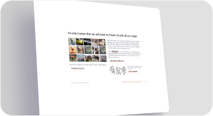 3/10/2018 2018 Design In Tech Report It's only human that we will work to thwart AI with all our might On March 28th, 2017 congress passed a law that makes it legal for your Internet Service Providers (ISP) to track and sell your personal activity online. This means that things you search for, buy, read, and say can be collected by corporations and used against you. Click this button , and your browser will start passively loading random sites in browser tabs. Leave it running to fill their databases with noise. Just quit your browser when you're done. —makeinternetnoise.com How do you turn a dog into a dar? Change a single pixel. How to hide from machines? How to —Technology Review become invisible in an increasingly visual age. —ANTFC version alpha* Source: @techreview @wired @madedotcom 2018 Design In Tech Report | Computational Design: AI 63 / 90 http://jmmbp001.local:5757/?ckcachecontrol=1520689902#16 63/90