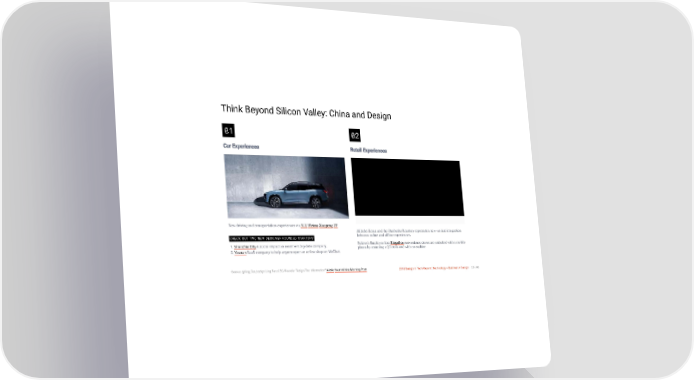 3/10/2018 2018 Design In Tech Report Think Beyond Silicon Valley: China and Design 01 02 Car Experiences Retail Experiences New driving and transportation experiences via NIO Weima Xiaopeng FF Alibaba Hema and the Starbucks Roastery represent a new vertical integration CHECK OUT TWO NEW DESIGNER-FOUNDED STARTUPS between online and offline experiences. 1. ShanZhai City A social impact assessment big-data company. Related: Employee-less BingoBox convenience stores are unlocked with a mobile phone by scanning a QR code and with no cashier. 2. Youzan SaaS company to help anyone open an online shop on WeChat. Source: @ling_fan_tezign Ling Fan, CEO/Founder Tezign The Information" Alizila South China Morning Post 2018 Design In Tech Report | Technology × Business × Design 25 / 90 http://jmmbp001.local:5757/?ckcachecontrol=1520689902#16 25/90