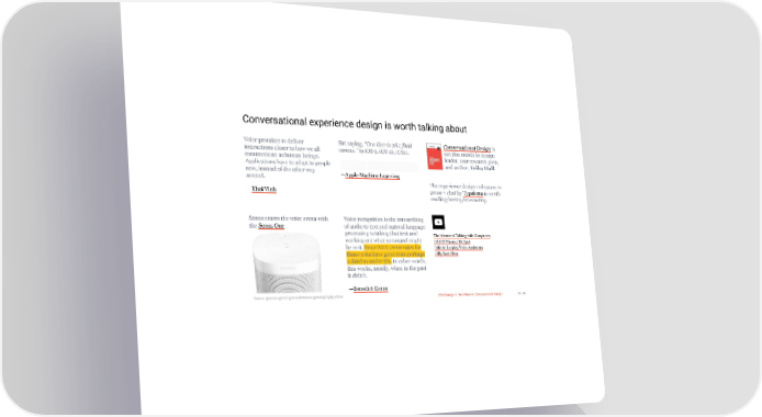 3/10/2018 2018 Design In Tech Report Conversational experience design is worth talking about Voice promises to deliver Siri saying, "One liter is 38.1 fluid Conversational Design is interactions closer to how we all ounces." in iOS 9, iOS 10, iOS11. out this month by design communicate as human beings. leader, user research guru, Applications have to adapt to people and author, Erika Hall. now, instead of the other way —Apple Machine Learning around. The experience design milestone in —Khoi Vinh prose × chat by Typeform is worth reading/seeing/interacting. Sonos enters the voice arena with Voice recognition is the transcribing the Sonos One of audio to text and natural language processing is taking that text and The Science of Talking with Computers working out what command might DAVID Miami / BK Spot be in it. Since 2012, error rates for Infinite Looping Voice Assistants these tasks have gone from perhaps Billy Bass Alexa a third to under 5%. In other words, this works, mostly, when in the past it didn't. —Benedict Evans Source: @sonos @khoi @benedictevans @mulegirl @typeform 2018 Design In Tech Report | Computational Design 54 / 90 http://jmmbp001.local:5757/?ckcachecontrol=1520689902#16 54/90