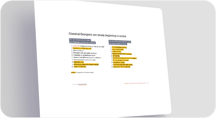 3/10/2018 2018 Design In Tech Report Classical Designers are slowly beginning to evolve The top 10 most critical issues The top 10 emerging trends to have and challenges currently facing design the biggest impact on design 1. (Classical) Design not having a "seat at the table" 1. AI and machine learning 2. Diversity in design and tech 2. Augmented Reality 3. Ethics in design 3. Virtual Reality 4. Education cost and equity of access 4. Behavior tracking and modeling 5. Consumer vs. social impact focus 5. 3D printing 6. Generational differences in the workforce 6. Distributed teams and virtual workplace 7. Environmental impacts of design 7. Democratization of design 8. Algorithm bias 8. Algorithmic design 9. Advertising supported content model 9. Crowdsourcing and open source 10. Dark UX patterns 10. Facial and voice recognition Highlight corresponds to computational design. Source: @aiga Design Census 2017 2018 Design In Tech Report | Technology × Business × Design 21 / 90 http://jmmbp001.local:5757/?ckcachecontrol=1520689902#16 21/90