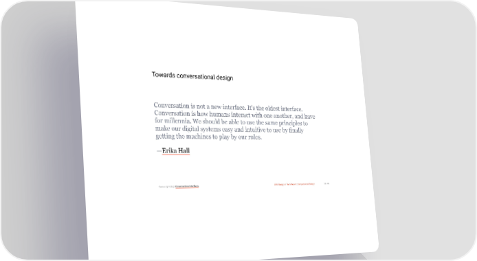 3/10/2018 2018 Design In Tech Report Towards conversational design Conversation is not a new interface. It's the oldest interface. Conversation is how humans interact with one another, and have for millennia. We should be able to use the same principles to make our digital systems easy and intuitive to use by finally getting the machines to play by our rules. —Erika Hall Source: @mulegirlConversational Interfaces 2018 Design In Tech Report | Computational Design 53 / 90 http://jmmbp001.local:5757/?ckcachecontrol=1520689902#16 53/90