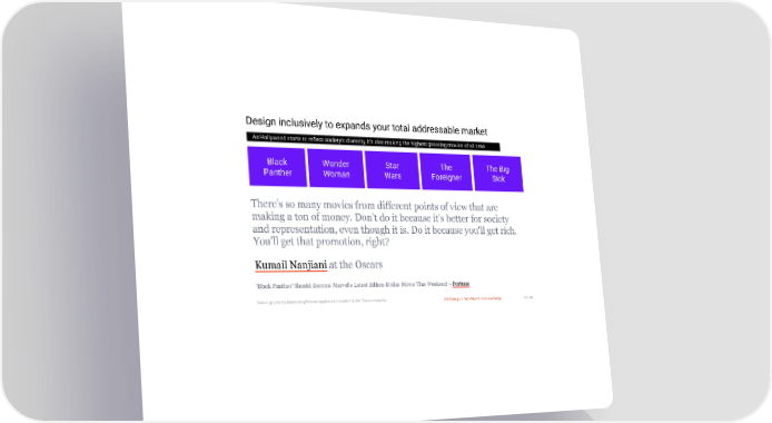 3/10/2018 2018 Design In Tech Report Design inclusively to expands your total addressable market As Hollywood starts to reflect society’s diversity, it’s also making the highest grossing movies of all time. Black Wonder Star The The Big Panther Woman Wars Foreigner Sick There's so many movies from different points of view that are making a ton of money. Don't do it because it's better for society and representation, even though it is. Do it because you'll get rich. You'll get that promotion, right? Kumail Nanjiani at the Oscars 'Black Panther' Should Become Marvel's Latest Billion-Dollar Movie This Weekend —Fortune Source: @upworthy #wakanda @fortunemagazine and consider the Star Trek economy too 2018 Design In Tech Report | Inclusive Design 87 / 90 http://jmmbp001.local:5757/?ckcachecontrol=1520689902#16 87/90