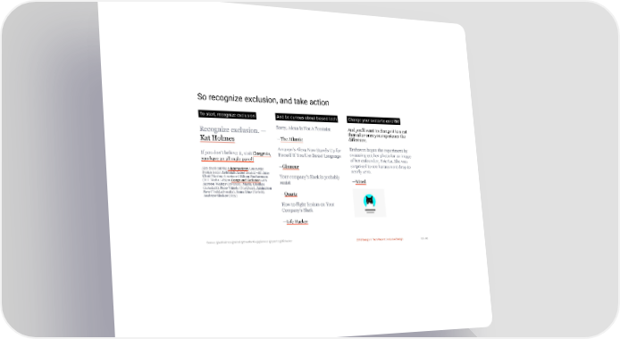 3/10/2018 2018 Design In Tech Report So recognize exclusion, and take action To start, recognize exclusion And be curious about biased tech Change your avatar to an URM Recognize exclusion. — Sorry, Alexa Is Not A Feminist And you'll want to change it to a cat thereafter once you experience the Kat Holmes —The Atlantic difference. Amazon's Alexa Now Stands Up for Enthoven began the experiment by If you don't believe it, visit Congrats, Herself If You Use Sexist Language swapping out her photo for an image you have an all male panel! of her cofounder, Eric Lu. She was —Glamour surprised to see harassment drop to Also check out the 4-hour podcast Automattic nearly zero. Design leader Ashleigh Axios created with Amy Choi (Mashup Americans) Ethan Zuckerman Your company's Slack is probably (MIT Media Lab) on Design and Exclusion with sexist —Wired Aarron Walter (InVision), Maria Giudice (Autodesk), Paco Viñoly (NextDoor), Aminatou Sow (TechLadymafia), Anne Diaz (Airbnb), —Quartz Andrew Sinkov (Etsy) How to Fight Sexism on Your Company's Slack —Life Hacker Source: @katholmes @wired @theatlantic @glamour @quartz @lifehacker 2018 Design In Tech Report | Inclusive Design 85 / 90 http://jmmbp001.local:5757/?ckcachecontrol=1520689902#16 85/90
