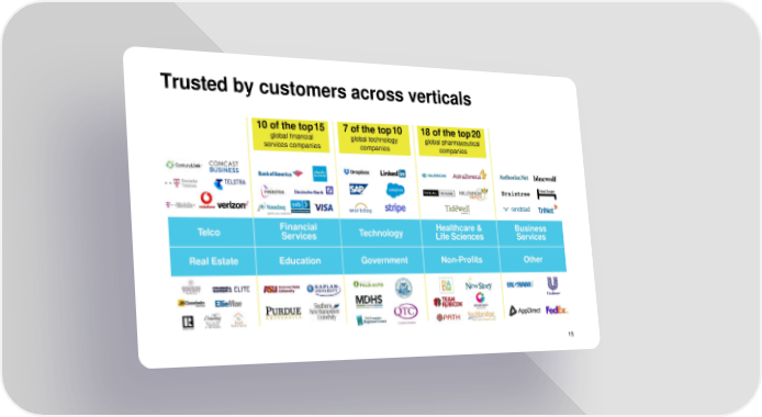 Trusted by customers across verticals 10 of the top15 7 of the top10 18 of the top20 global financial global technology global pharmaceutical services companies companies companies Telco Financial Technology Healthcare & Business Services Life Sciences Services RealEstate Education Government Non-Profits Other 15