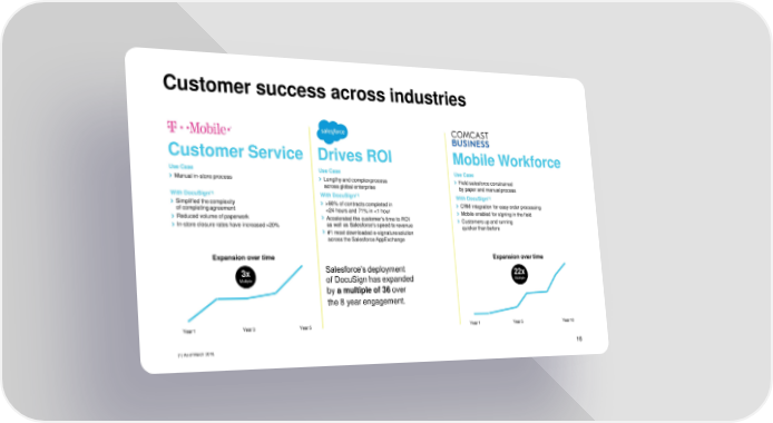 Customer success across industries CustomerService DrivesROI MobileWorkforce UseCase UseCase UseCase Manual in-store process Lengthy and complexprocess Field salesforce constrained across global enterprise by paper and manualprocess With DocuSign(1) With DocuSign(1) With DocuSign(1) Simplified thecomplexity >90% of contracts completedin CRM integration for easy order processing of completingagreement <24 hours and 71% in <1 hour Mobile enabled for signing in the field Reduced volume ofpaperwork Accelerated the customer’s time to ROI Customers up andrunning In-store closure rates have increased>20% as well as Salesforce’s speed torevenue quicker thanbefore #1 most downloaded e-signaturesolution across the SalesforceAppExchange Expansion overtime Expansion overtime 3x Salesforce’sdeployment 22x Multiple of DocuSign hasexpanded Multiple by a multiple of 36 over the 8 year engagement. Year1 Year3 Year5 Year1 Year5 Year10 (1) As of March 2018. 16