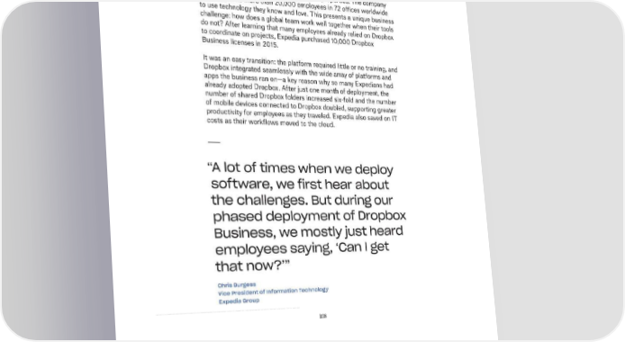 2/24/2018 S-1 Table of Contents Expedia Expedia offers online travel booking for flights, hotels, car rentals, and more through its portfolio of over 200 web properties. The company encourages its more than 20,000 employees in 72 offices worldwide to use technology they know and love. This presents a unique business challenge: how does a global team work well together when their tools do not? After learning that many employees already relied on Dropbox to coordinate on projects, Expedia purchased 10,000 Dropbox Business licenses in 2015. It was an easy transition: the platform required little or no training, and Dropbox integrated seamlessly with the wide array of platforms and apps the business ran on—a key reason why so many Expedians had already adopted Dropbox. After just one month of deployment, the number of shared Dropbox folders increased sixfold and the number of mobile devices connected to Dropbox doubled, supporting greater productivity for employees as they traveled. Expedia also saved on IT costs as their workflows moved to the cloud. “A lot of times when we deploy software, we first hear about the challenges. But during our phased deployment of Dropbox Business, we mostly just heard employees saying, ‘Can I get that now?’” Chris Burgess Vice President of Information Technology Expedia Group 108 https://www.sec.gov/Archives/edgar/data/1467623/000119312518055809/d451946ds1.htm 116/235