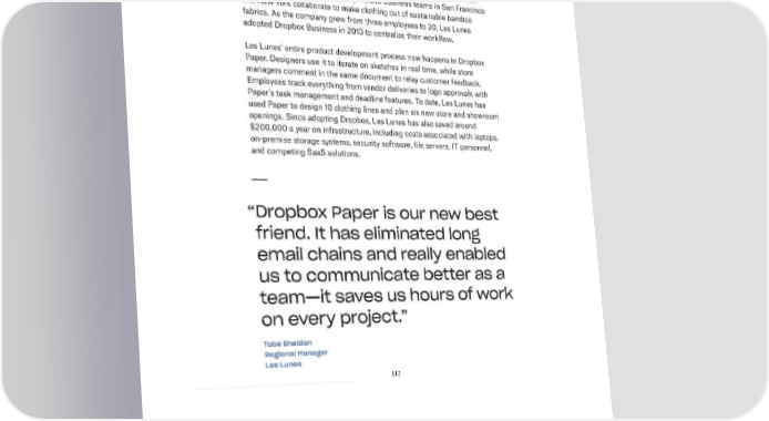 2/24/2018 S-1 Table of Contents 112 Les Lune Les Lunes is a fashion and apparel company. Designers in Paris and Los Angeles, manufacturers in Shanghai, and business teams in San Francisco and New York collaborate to make clothing out of sustainable bamboo fabrics. As the company grew from three employees to 20, Les Lunes adopted Dropbox Business in 2013 to centralize their workflow. Les Lunes’ entire product development process now happens in Dropbox Paper. Designers use it to iterate on sketches in real time, while store managers comment in the same document to relay customer feedback. Employees track everything from vendor deliveries to logo approvals with Paper’s task management and deadline features. To date, Les Lunes has used Paper to design 10 clothing lines and plan six new store and showroom openings. Since adopting Dropbox, Les Lunes has also saved around $200,000 a year on infrastructure, including costs associated with laptops, onpremise storage systems, security software, file servers, IT personnel, and competing SaaS solutions. “Dropbox Paper is our new best friend. It has eliminated long email chains and really enabled us to communicate better as a team—it saves us hours of work on every project.” Tobe Sheldon Regional Manager Les Lunes https://www.sec.gov/Archives/edgar/data/1467623/000119312518055809/d451946ds1.htm 120/235