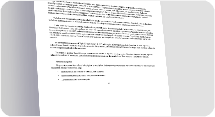 2/24/2018 S-1 Table of Contents In the period the relevant performance vesting condition becomes probable, we will recognize the cumulative unrecognized expense of our two tier RSUs and CoFounder Grants, which will increase our cost of revenue and operating expenses with respect to our twotier RSUs, and will increase our general and administrative expenses with respect to our CoFounder Grants, for the quarter and year of our initial public offering. We expect that our research and development expenses will be the line item most significantly impacted by the cumulative expense to be recognized. See Note 1, “Description of the Business and Summary of Significant Accounting Policies” and Note 11, “Stockholders’ Equity” to our consolidated financial statements included elsewhere in this prospectus for more information. Critical Accounting Policies and Judgments Our consolidated financial statements and the related notes thereto included elsewhere in this prospectus are prepared in accordance with generally accepted accounting principles, or GAAP, in the United States. The preparation of consolidated financial statements also requires us to make estimates and assumptions that affect the reported amounts of assets, liabilities, revenue, costs and expenses, and related disclosures. We base our estimates on historical experience and on various other assumptions that we believe to be reasonable under the circumstances. Actual results could differ significantly from the estimates made by management. To the extent that there are differences between our estimates and actual results, our future financial statement presentation, financial condition, results of operations, and cash flows will be affected. We believe that the accounting policies described below involve a greater degree of judgment and complexity. Accordingly, these are the policies we believe are the most critical to aid in fully understanding and evaluating our consolidated financial condition and results of operations. In May 2014, the Financial Accounting Standards Board, or FASB, issued Accounting Standards Update, or ASU, No. 201409 Revenue from Contracts with Customers (Topic 606), or Topic 606. Topic 606 supersedes the revenue recognition requirements in Accounting Standards Codification, Revenue Recognition, or Topic 605, and requires the recognition of revenue when promised goods or services are transferred to customers in an amount that reflects the consideration to which the entity expects to be entitled to in exchange for those goods or services. Topic 606 also includes Subtopic 34040, Other Assets and Deferred Costs—Contracts with Customers, which requires the deferral of incremental costs of obtaining a contract with a customer. We adopted the requirements of Topic 606 as of January 1, 2017, utilizing the full retrospective method of transition. As such, Topic 606 is reflected in our financial results for all periods presented in this prospectus. The adoption of Topic 606 resulted in changes to our accounting policies for revenue recognition and deferred commissions. The impact of adopting Topic 606 on our revenue was not material to any of the periods presented. The primary impact of adopting Topic 606 relates to the deferral of incremental costs of obtaining customer contracts and the amortization of those costs over a longer period of benefit. Revenue recognition We generate revenue from sales of subscriptions to our platform. Subscription fees exclude sales and other indirect taxes. We determine revenue recognition through the following steps: • Identification of the contract, or contracts, with a customer • Identification of the performance obligations in the contract • Determination of the transaction price 83 https://www.sec.gov/Archives/edgar/data/1467623/000119312518055809/d451946ds1.htm 91/235