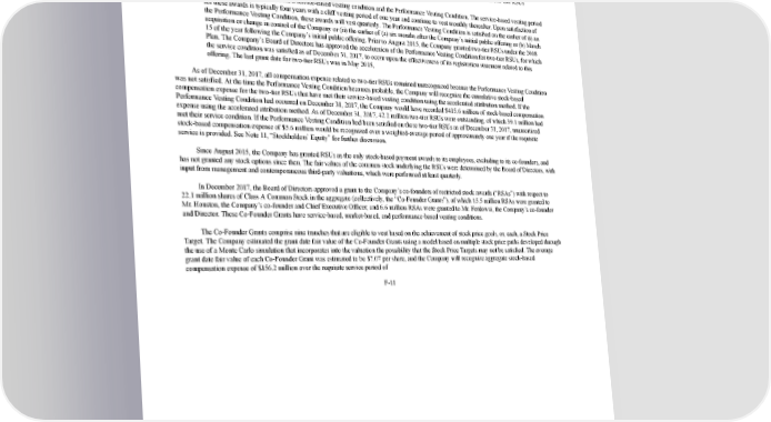 2/24/2018 S-1 Table of Contents Stockbased compensation The Company has granted RSUs to its employees and members of the Board of Directors under the 2008 Equity Incentive Plan (“2008 Plan”) and the 2017 Equity Incentive Plan (“2017 Plan”). The Company had two types of RSUs outstanding as of December 31, 2017: • Onetier RSUs, which have a servicebased vesting condition over a four year period. These awards typically have a cliff vesting period of one year and continue to vest quarterly thereafter. The Company began granting onetier RSUs under its 2008 Plan in August 2015 and it continues to grant onetier RSUs under its 2017 Plan. The Company recognizes compensation expense associated with onetier RSUs ratably on a straightline basis over the requisite service period. • Twotier RSUs, which have both a servicebased vesting condition and the Performance Vesting Condition. The servicebased vesting period for these awards is typically four years with a cliff vesting period of one year and continue to vest monthly thereafter. Upon satisfaction of the Performance Vesting Condition, these awards will vest quarterly. The Performance Vesting Condition is satisfied on the earlier of (i) an acquisition or change in control of the Company or (ii) the earlier of (a) six months after the Company’s initial public offering or (b) March 15 of the year following the Company’s initial public offering. Prior to August 2015, the Company granted twotier RSUs under the 2008 Plan. The Company’s Board of Directors has approved the acceleration of the Performance Vesting Condition for twotier RSUs, for which the service condition was satisfied as of December 31, 2017, to occur upon the effectiveness of its registration statement related to this offering. The last grant date for twotier RSUs was in May 2015. As of December 31, 2017, all compensation expense related to twotier RSUs remained unrecognized because the Performance Vesting Condition was not satisfied. At the time the Performance Vesting Condition becomes probable, the Company will recognize the cumulative stockbased compensation expense for the twotier RSUs that have met their servicebased vesting condition using the accelerated attribution method. If the Performance Vesting Condition had occurred on December 31, 2017, the Company would have recorded $415.6 million of stockbased compensation expense using the accelerated attribution method. As of December 31, 2017, 42.2 million twotier RSUs were outstanding, of which 39.1 million had met their service condition. If the Performance Vesting Condition had been satisfied on these twotier RSUs as of December 31, 2017, unamortized stockbased compensation expense of $5.6 million would be recognized over a weightedaverage period of approximately one year if the requisite service is provided. See Note 11, “Stockholders’ Equity” for further discussion. Since August 2015, the Company has granted RSUs as the only stockbased payment awards to its employees, excluding to its cofounders, and has not granted any stock options since then. The fair values of the common stock underlying the RSUs were determined by the Board of Directors, with input from management and contemporaneous thirdparty valuations, which were performed at least quarterly. In December 2017, the Board of Directors approved a grant to the Company’s cofounders of restricted stock awards (“RSAs”) with respect to 22.1 million shares of Class A Common Stock in the aggregate (collectively, the “CoFounder Grants”), of which 15.5 million RSAs were granted to Mr. Houston, the Company’s cofounder and Chief Executive Officer, and 6.6 million RSAs were granted to Mr. Ferdowsi, the Company’s cofounder and Director. These CoFounder Grants have servicebased, marketbased, and performancebased vesting conditions. The CoFounder Grants comprise nine tranches that are eligible to vest based on the achievement of stock price goals, or, each, a Stock Price Target. The Company estimated the grant date fair value of the CoFounder Grants using a model based on multiple stock price paths developed through the use of a Monte Carlo simulation that incorporates into the valuation the possibility that the Stock Price Targets may not be satisfied. The average grant date fair value of each CoFounder Grant was estimated to be $7.07 per share, and the Company will recognize aggregate stockbased compensation expense of $156.2 million over the requisite service period of F11 https://www.sec.gov/Archives/edgar/data/1467623/000119312518055809/d451946ds1.htm 201/235