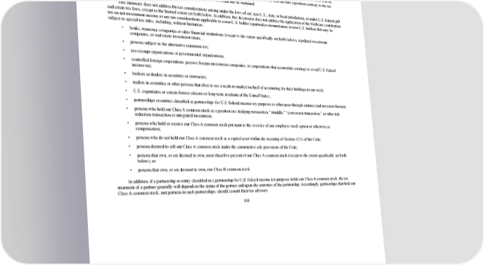 2/24/2018 S-1 Table of Contents MATERIAL U.S. FEDERAL INCOME TAX CONSEQUENCES TO NONU.S. HOLDERS OF OUR CLASS A COMMON STOCK The following is a summary of the material U.S. federal income tax consequences to certain nonU.S. holders (as defined below) of the ownership and disposition of our Class A common stock but does not purport to be a complete analysis of all the potential tax considerations relating thereto. This summary is based upon the provisions of the Internal Revenue Code of 1986, as amended, or the Code, Treasury Regulations promulgated thereunder, administrative rulings, and judicial decisions, all as of the date hereof. These authorities may be changed, possibly retroactively, so as to result in U.S. federal income tax consequences different from those set forth below. No ruling from the Internal Revenue Service, or the IRS, has been, or will be, sought with respect to the tax consequences discussed herein, and there can be no assurance that the IRS will not take a position contrary to the tax consequences discussed below or that any position taken by the IRS would not be sustained. This summary does not address the tax considerations arising under the laws of any nonU.S., state, or local jurisdiction, or under U.S. federal gift and estate tax laws, except to the limited extent set forth below. In addition, this discussion does not address the application of the Medicare contribution tax on net investment income or any tax considerations applicable to a nonU.S. holder’s particular circumstances or nonU.S. holders that may be subject to special tax rules, including, without limitation: • banks, insurance companies or other financial institutions (except to the extent specifically set forth below), regulated investment companies, or real estate investment trusts; • persons subject to the alternative minimum tax; • taxexempt organizations or governmental organizations; • controlled foreign corporations, passive foreign investment companies, or corporations that accumulate earnings to avoid U.S. federal income tax; • brokers or dealers in securities or currencies; • traders in securities or other persons that elect to use a marktomarket method of accounting for their holdings in our stock; • U.S. expatriates or certain former citizens or longterm residents of the United States; • partnerships or entities classified as partnerships for U.S. federal income tax purposes or other passthrough entities (and investors therein); • persons who hold our Class A common stock as a position in a hedging transaction, “straddle,” “conversion transaction,” or other risk reduction transaction or integrated investment; • persons who hold or receive our Class A common stock pursuant to the exercise of any employee stock option or otherwise as compensation; • persons who do not hold our Class A common stock as a capital asset within the meaning of Section 1221 of the Code; • persons deemed to sell our Class A common stock under the constructive sale provisions of the Code; • persons that own, or are deemed to own, more than five percent of our Class A common stock (except to the extent specifically set forth below); or • persons that own, or are deemed to own, our Class B common stock. In addition, if a partnership or entity classified as a partnership for U.S. federal income tax purposes holds our Class A common stock, the tax treatment of a partner generally will depend on the status of the partner and upon the activities of the partnership. Accordingly, partnerships that hold our Class A common stock, and partners in such partnerships, should consult their tax advisors. 168 https://www.sec.gov/Archives/edgar/data/1467623/000119312518055809/d451946ds1.htm 176/235