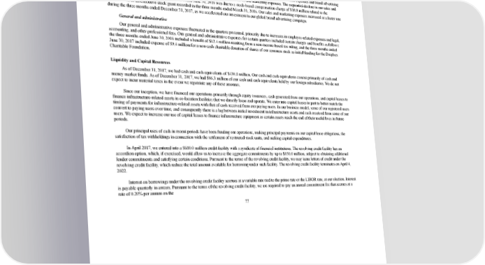 2/24/2018 S-1 Table of Contents Research and development Our research and development expenses increased at a faster rate during the three months ended March 31, 2017, comparatively to other quarters, primarily due to headcount growth and employeerelated costs. Sales and marketing Our sales and marketing expenses generally increased in the quarters presented primarily due to employeerelated expenses and brand advertising campaigns. The timing of brand advertising campaigns can impact the trends in sales and marketing expenses. The sequential decline in our sales and marketing expenses during the three months ended June 30, 2016 was due to a stockbased compensation charge of $18.8 million related to the modification of an executive stock grant recorded in the three months ended March 31, 2016. Our sales and marketing expenses increased at a faster rate during the three months ended December 31, 2017, as we accelerated our investment in our global brand advertising campaign. General and administrative Our general and administrative expenses fluctuated in the quarters presented, primarily due to increases in employeerelated expenses and legal, accounting, and other professional fees. Our general and administrative expenses for certain quarters included certain charges and benefits as follows: the three months ended June 30, 2016 included a benefit of $12.4 million resulting from a nonincome based tax ruling, and the three months ended June 30, 2017 included expense of $9.4 million for a noncash charitable donation of shares of our common stock as initial funding for the Dropbox Charitable Foundation. Liquidity and Capital Resources As of December 31, 2017, we had cash and cash equivalents of $430.0 million. Our cash and cash equivalents consist primarily of cash and money market funds. As of December 31, 2017, we had $86.3 million of our cash and cash equivalents held by our foreign subsidiaries. We do not expect to incur material taxes in the event we repatriate any of these amounts. Since our inception, we have financed our operations primarily through equity issuances, cash generated from our operations, and capital leases to finance infrastructurerelated assets in colocation facilities that we directly lease and operate. We enter into capital leases in part to better match the timing of payments for infrastructurerelated assets with that of cash received from our paying users. In our business model, some of our registered users convert to paying users over time, and consequently there is a lag between initial investment in infrastructure assets and cash received from some of our users. We expect to increase our use of capital leases to finance infrastructure equipment as certain assets reach the end of their useful lives in future periods. Our principal uses of cash in recent periods have been funding our operations, making principal payments on our capital lease obligations, the satisfaction of tax withholdings in connection with the settlement of restricted stock units, and making capital expenditures. In April 2017, we entered into a $600.0 million credit facility with a syndicate of financial institutions. The revolving credit facility has an accordion option, which, if exercised, would allow us to increase the aggregate commitments by up to $150.0 million, subject to obtaining additional lender commitments and satisfying certain conditions. Pursuant to the terms of the revolving credit facility, we may issue letters of credit under the revolving credit facility, which reduce the total amount available for borrowing under such facility. The revolving credit facility terminates on April 4, 2022. Interest on borrowings under the revolving credit facility accrues at a variable rate tied to the prime rate or the LIBOR rate, at our election. Interest is payable quarterly in arrears. Pursuant to the terms of the revolving credit facility, we are required to pay an annual commitment fee that accrues at a rate of 0.20% per annum on the 77 https://www.sec.gov/Archives/edgar/data/1467623/000119312518055809/d451946ds1.htm 85/235