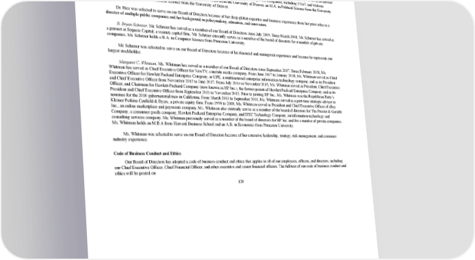 2/24/2018 S-1 Table of Contents Policy for the Hoover Institution, Stanford University, as a Senior Fellow for the Freeman Spogli Institute for International Studies, Stanford University, and as a Professor of Political Science for Stanford University. Dr. Rice has served as a partner at RiceHadleyGates LLC, an international strategic consulting firm that Dr. Rice founded, since November 2009. From January 2005 to January 2009, Dr. Rice served as the Secretary of State of the United States of America. From January 2001 to January 2005, Dr. Rice served as Chief National Security Advisor to President George W. Bush. Beginning in 1981, she served in various roles at Stanford University, including serving as Provost from 19931999. Dr. Rice previously served as a member of the board of directors of Charles Schwab Corporation, a bank and brokerage firm, Chevron Corporation, a multinational energy corporation, Transamerica Corporation, a life insurance and investment company, and KiOR, Inc., a renewable fuels company. Dr. Rice currently serves as an advisor for a number of other public companies, and as a member of the board directors for a number of private companies, including C3IoT and Makena Capital Management, LLC. Dr. Rice holds a Ph.D. in Political Science from the University of Denver, an M.A. in Political Science from the University of Notre Dame and a B.A in Political Science from the University of Denver. Dr. Rice was selected to serve on our Board of Directors because of her deep global expertise and business experience from her prior roles as a director of multiple public companies and her background in policymaking, education, and innovation. R. Bryan Schreier. Mr. Schreier has served as a member of our Board of Directors since July 2009. Since March 2008, Mr. Schreier has served as a partner at Sequoia Capital, a venture capital firm. Mr. Schreier currently serves as a member of the board of directors for a number of private companies. Mr. Schreier holds a B.A. in Computer Science from Princeton University. Mr. Schreier was selected to serve on our Board of Directors because of his financial and managerial experience and because he represents our largest stockholder. Margaret C. Whitman. Ms. Whitman has served as a member of our Board of Directors since September 2017. Since February 2018, Ms. Whitman has served as Chief Executive Officer for NewTV, a mobile media company. From June 2017 to January 2018, Ms. Whitman served as Chief Executive Officer for Hewlett Packard Enterprise Company, or HPE, a multinational enterprise information technology company, and as its President and Chief Executive Officer from November 2015 to June 2017. From July 2014 to November 2015, Ms. Whitman served as President, Chief Executive Officer, and Chairman for HewlettPackard Company (now known as HP Inc.), the former parent of Hewlett Packard Enterprise Company, and as its President and Chief Executive Officer from September 2011 to November 2015. Prior to joining HP Inc., Ms. Whitman was the Republican Party’s nominee for the 2010 gubernatorial race in California. From March 2011 to September 2011, Ms. Whitman served as a parttime strategic advisor to Kleiner Perkins Caufield & Byers, a private equity firm. From 1998 to 2008, Ms. Whitman served as President and Chief Executive Officer of eBay Inc., an online marketplace and payments company. Ms. Whitman also currently serves as a member of the board of directors for The Procter & Gamble Company, a consumer goods company, Hewlett Packard Enterprise Company, and DXC Technology Company, an information technology and consulting services company. Ms. Whitman previously served as a member of the board of directors for HP Inc. and for a number of private companies. Ms. Whitman holds an M.B.A from Harvard Business School and an A.B. in Economics from Princeton University. Ms. Whitman was selected to serve on our Board of Directors because of her extensive leadership, strategy, risk management, and consumer industry experience. Code of Business Conduct and Ethics Our Board of Directors has adopted a code of business conduct and ethics that applies to all of our employees, officers, and directors, including our Chief Executive Officer, Chief Financial Officer, and other executive and senior financial officers. The full text of our code of business conduct and ethics will be posted on 128 https://www.sec.gov/Archives/edgar/data/1467623/000119312518055809/d451946ds1.htm 136/235