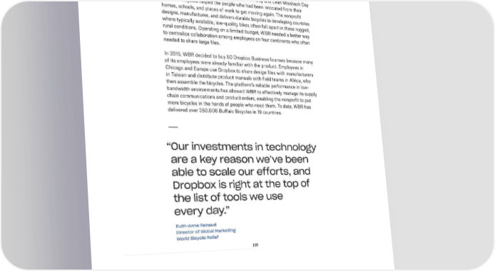 2/24/2018 S-1 Table of Contents 118 World Bicycle Relief World Bicycle Relief (WBR) was founded in the aftermath of the December 2004 Indian Ocean tsunami. Cofounders F.K. Day and Leah Missbach Day saw how bicycles helped the people who had been relocated from their homes, schools, and places of work to get moving again. The nonprofit designs, manufactures, and delivers durable bicycles to developing countries where typically available, lowquality bikes often fall apart in these rugged, rural conditions. Operating on a limited budget, WBR needed a better way to centralize collaboration among employees on four continents who often needed to share large files. In 2015, WBR decided to buy 50 Dropbox Business licenses because many of its employees were already familiar with the product. Employees in Chicago and Europe use Dropbox to share design files with manufacturers in Taiwan and distribute product manuals with field teams in Africa, who then assemble the bicycles. The platform’s reliable performance in lowbandwidth environments has allowed WBR to effectively manage its supply chain communications and product orders, enabling the nonprofit to put more bicycles in the hands of people who need them. To date, WBR has delivered over 350,000 Buffalo Bicycles in 19 countries. “Our investments in technology are a key reason we’ve been able to scale our efforts, and Dropbox is right at the top of the list of tools we use every day.” RuthAnne Renaud Director of Global Marketing World Bicycle Relief https://www.sec.gov/Archives/edgar/data/1467623/000119312518055809/d451946ds1.htm 126/235