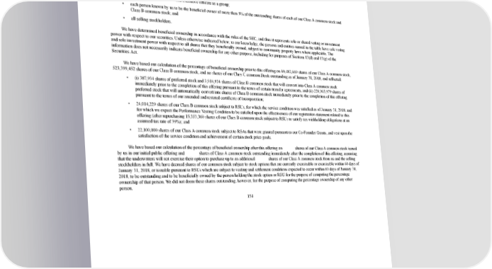 2/24/2018 S-1 Table of Contents PRINCIPAL AND SELLING STOCKHOLDERS The following table sets forth certain information with respect to the beneficial ownership of our capital stock as of January 31, 2018, and as adjusted to reflect the sale of our common stock offered by us and the selling stockholders in this offering assuming no exercise of the underwriters’ option to purchase additional shares of our common stock from us and the selling stockholders, for: • each of our named executive officers; • each of our directors; • all of our current directors and executive officers as a group; • each person known by us to be the beneficial owner of more than 5% of the outstanding shares of each of our Class A common stock and Class B common stock; and • all selling stockholders. We have determined beneficial ownership in accordance with the rules of the SEC, and thus it represents sole or shared voting or investment power with respect to our securities. Unless otherwise indicated below, to our knowledge, the persons and entities named in the table have sole voting and sole investment power with respect to all shares that they beneficially owned, subject to community property laws where applicable. The information does not necessarily indicate beneficial ownership for any other purpose, including for purposes of Sections 13(d) and 13(g) of the Securities Act. We have based our calculation of the percentage of beneficial ownership prior to this offering on 40,482,669 shares of our Class A common stock, 523,399,452 shares of our Class B common stock, and no shares of our Class C common Stock outstanding as of January 31, 2018, and reflected: • (i) 387,934 shares of preferred stock and 3,914,934 shares of Class B common stock that will convert into Class A common stock immediately prior to the completion of this offering pursuant to the terms of certain transfer agreements, and (ii) 220,965,979 shares of preferred stock that will automatically convert into shares of Class B common stock immediately prior to the completion of this offering pursuant to the terms of our amended and restated certificate of incorporation; • 24,014,229 shares of our Class B common stock subject to RSUs, for which the service condition was satisfied as of January 31, 2018, and for which we expect the Performance Vesting Condition to be satisfied upon the effectiveness of our registration statement related to this offering (after repurchasing 15,353,360 shares of our Class B common stock subject to RSUs to satisfy tax withholding obligations at an assumed tax rate of 39%); and • 22,100,000 shares of our Class A common stock subject to RSAs that were granted pursuant to our CoFounder Grants, and vest upon the satisfaction of the service condition and achievement of certain stock price goals. We have based our calculation of the percentage of beneficial ownership after this offering on shares of our Class A common stock issued by us in our initial public offering and shares of Class A common stock outstanding immediately after the completion of this offering, assuming that the underwriters will not exercise their option to purchase up to an additional shares of our Class A common stock from us and the selling stockholders in full. We have deemed shares of our common stock subject to stock options that are currently exercisable or exercisable within 60 days of January 31, 2018, or issuable pursuant to RSUs which are subject to vesting and settlement conditions expected to occur within 60 days of January 31, 2018, to be outstanding and to be beneficially owned by the person holding the stock option or RSU for the purpose of computing the percentage ownership of that person. We did not deem these shares outstanding, however, for the purpose of computing the percentage ownership of any other person. 154 https://www.sec.gov/Archives/edgar/data/1467623/000119312518055809/d451946ds1.htm 162/235
