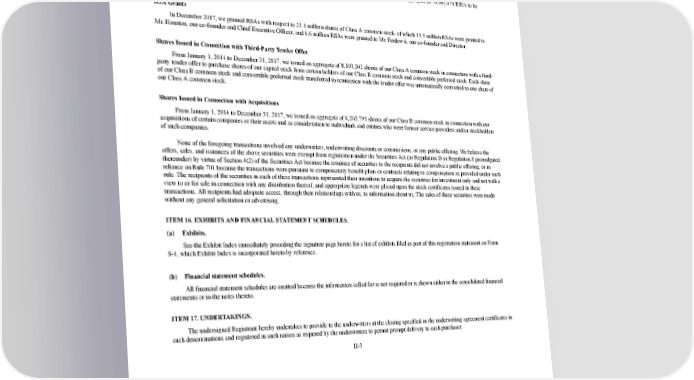 2/24/2018 S-1 Table of Contents Option and RSU Issuances From January 1, 2014 to December 31, 2017, we granted to our directors, officers, employees, consultants, and other service providers options to purchase an aggregate of 15,443,120 shares of our Class B common stock under our 2008 Plan at exercise prices ranging from approximately $13.84 to $16.82 per share. From January 1, 2014 to December 31, 2017, we granted to our directors, officers, employees, consultants, and other service providers an aggregate of 28,780,524 RSUs to be settled in shares of our Class A common stock under our 2017 Plan and an aggregate of 76,983,474 RSUs to be settled in shares of our Class B common stock under our 2008 Plan. RSA Grants In December 2017, we granted RSAs with respect to 22.1 million shares of Class A common stock, of which 15.5 million RSAs were granted to Mr. Houston, our cofounder and Chief Executive Officer, and 6.6 million RSAs were granted to Mr. Ferdowsi, our cofounder and Director. Shares Issued in Connection with ThirdParty Tender Offer From January 1, 2014 to December 31, 2017, we issued an aggregate of 8,193,202 shares of our Class A common stock in connection with a third party tender offer to purchase shares of our capital stock from certain holders of our Class B common stock and convertible preferred stock. Each share of our Class B common stock and convertible preferred stock transferred in connection with the tender offer was automatically converted to one share of our Class A common stock. Shares Issued in Connection with Acquisitions From January 1, 2014 to December 31, 2017, we issued an aggregate of 6,265,795 shares of our Class B common stock in connection with our acquisitions of certain companies or their assets and as consideration to individuals and entities who were former service providers and/or stockholders of such companies. None of the foregoing transactions involved any underwriters, underwriting discounts or commissions, or any public offering. We believe the offers, sales, and issuances of the above securities were exempt from registration under the Securities Act (or Regulation D or Regulation S promulgated thereunder) by virtue of Section 4(2) of the Securities Act because the issuance of securities to the recipients did not involve a public offering, or in reliance on Rule 701 because the transactions were pursuant to compensatory benefit plans or contracts relating to compensation as provided under such rule. The recipients of the securities in each of these transactions represented their intentions to acquire the securities for investment only and not with a view to or for sale in connection with any distribution thereof, and appropriate legends were placed upon the stock certificates issued in these transactions. All recipients had adequate access, through their relationships with us, to information about us. The sales of these securities were made without any general solicitation or advertising. ITEM 16. EXHIBITS AND FINANCIAL STATEMENT SCHEDULES. (a) Exhibits. See the Exhibit Index immediately preceding the signature page hereto for a list of exhibits filed as part of this registration statement on Form S1, which Exhibit Index is incorporated herein by reference. (b) Financial statement schedules. All financial statement schedules are omitted because the information called for is not required or is shown either in the consolidated financial statements or in the notes thereto. ITEM 17. UNDERTAKINGS. The undersigned Registrant hereby undertakes to provide to the underwriters at the closing specified in the underwriting agreement certificates in such denominations and registered in such names as required by the underwriters to permit prompt delivery to each purchaser. II3 https://www.sec.gov/Archives/edgar/data/1467623/000119312518055809/d451946ds1.htm 230/235