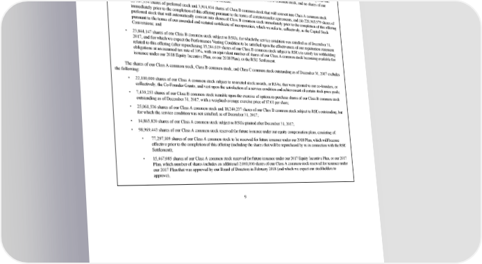 2/24/2018 S-1 Table of Contents standards of “due diligence” with respect to, the registration statement. has agreed to act as qualified independent underwriter for this offering and to undertake the legal responsibilities and liabilities of an underwriter under the Securities Act of 1933, as amended, or the Securities Act. The number of shares of our Class A common stock, Class B common stock, and Class C common stock that will be outstanding after this offering is based on 17,727,212 shares of our Class A common stock, 522,752,944 shares of our Class B common stock, and no shares of our Class C common stock outstanding as of December 31, 2017, and reflects: • (i) 387,934 shares of preferred stock and 3,914,934 shares of Class B common stock that will convert into Class A common stock immediately prior to the completion of this offering pursuant to the terms of certain transfer agreements, and (ii) 220,965,979 shares of preferred stock that will automatically convert into shares of Class B common stock immediately prior to the completion of this offering pursuant to the terms of our amended and restated certificate of incorporation, which we refer to, collectively, as the Capital Stock Conversions; and • 23,844,147 shares of our Class B common stock subject to RSUs, for which the service condition was satisfied as of December 31, 2017, and for which we expect the Performance Vesting Condition to be satisfied upon the effectiveness of our registration statement related to this offering (after repurchasing 15,244,619 shares of our Class B common stock subject to RSUs to satisfy tax withholding obligations at an assumed tax rate of 39%, with an equivalent number of shares of our Class A common stock becoming available for issuance under our 2018 Equity Incentive Plan, or our 2018 Plan), or the RSU Settlement. The shares of our Class A common stock, Class B common stock, and Class C common stock outstanding as of December 31, 2017 excludes the following: • 22,100,000 shares of our Class A common stock subject to restricted stock awards, or RSAs, that were granted to our cofounders, or collectively, the CoFounder Grants, and vest upon the satisfaction of a service condition and achievement of certain stock price goals; • 7,439,253 shares of our Class B common stock issuable upon the exercise of options to purchase shares of our Class B common stock outstanding as of December 31, 2017, with a weightedaverage exercise price of $7.01 per share; • 25,061,536 shares of our Class A common stock and 18,240,237 shares of our Class B common stock subject to RSUs outstanding, but for which the service condition was not satisfied, as of December 31, 2017; • 14,865,820 shares of our Class A common stock subject to RSUs granted after December 31, 2017; • 98,969,443 shares of our Class A common stock reserved for future issuance under our equity compensation plans, consisting of: • 77,297,109 shares of our Class A common stock to be reserved for future issuance under our 2018 Plan, which will become effective prior to the completion of this offering (including the shares that will be repurchased by us in connection with the RSU Settlement); • 15,467,085 shares of our Class A common stock reserved for future issuance under our 2017 Equity Incentive Plan, or our 2017 Plan, which number of shares includes an additional 2,000,000 shares of our Class A common stock reserved for issuance under our 2017 Plan that was approved by our Board of Directors in February 2018 (and which we expect our stockholders to approve), 9 https://www.sec.gov/Archives/edgar/data/1467623/000119312518055809/d451946ds1.htm 16/235