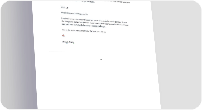 2/24/2018 S-1 Table of Contents And while we’re at scale, we can still move quickly. We have a lot less baggage than the incumbents. The legacy office suites have had a good run, but they were designed for a world where the most important thing you did was print something out. There’s a reason why BlackBerry didn’t come up with the iPhone. Sometimes it’s better to start fresh. But what gives Arash and me the most confidence is our team of nearly 2,000 Dropboxers around the world. We’re a little biased, but we think we have one of the most talented teams ever assembled, and we grow stronger every year. Join us We all deserve a fulfilling work life. Imagine if every minute at work were well spent—if we could focus and spend our time on the things that matter. Imagine how much more inspired we’d be. Imagine how much better equipped we’d be to tackle humanity’s biggest challenges. This is the world we want to live in. We hope you’ll join us. Drew & Arash 91 https://www.sec.gov/Archives/edgar/data/1467623/000119312518055809/d451946ds1.htm 99/235