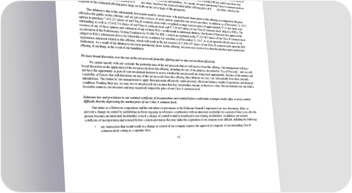 2/24/2018 S-1 Table of Contents Sales of our shares as restrictions end or pursuant to registration rights may make it more difficult for us to sell equity securities in the future at a time and at a price that we deem appropriate. These sales also could cause the trading price of our Class A common stock to fall and make it more difficult for you to sell shares of our Class A common stock. If you purchase our Class A common stock in this offering, you will incur immediate and substantial dilution. The initial public offering price is substantially higher than the pro forma net tangible book value per share of our outstanding common stock of $ per share as of December 31, 2017. Investors purchasing shares of our Class A common stock in this offering will pay a price per share that substantially exceeds the book value of our tangible assets after subtracting our liabilities. As a result, investors purchasing Class A common stock in this offering will incur immediate dilution of $ per share, based on the assumed initial public offering price of $ per share, which is the midpoint of the estimated offering price range set forth on the cover page of this prospectus. This dilution is due to the substantially lower price paid by our investors who purchased shares prior to this offering as compared to the price offered to the public in this offering, and any previous exercise of stock options granted to our service providers. In addition, as of December 31, 2017, options to purchase 7,439,253 shares of our Class B common stock with a weightedaverage exercise price of approximately $7.01 per share were outstanding as well as 25,061,536 shares of our Class A common stock and 57,329,003 shares of our Class B common stock subject to RSUs. The exercise of any of these options and settlement of any of these RSUs would result in additional dilution. Our Board of Directors has approved the acceleration of the Performance Vesting Condition for 39,088,766 RSUs (which are included in the 57,329,003 shares of our Class B common stock subject to RSUs referenced above) for which the service condition was satisfied as of December 31, 2017, to occur upon the effectiveness of our registration statement related to this offering, which will result in the net issuance of 23,844,147 shares of our Class B common stock upon the RSU Settlement. As a result of the dilution to investors purchasing shares in this offering, investors may receive less than the purchase price paid in this offering, if anything, in the event of our liquidation. We have broad discretion over the use of the net proceeds from this offering and we may not use them effectively. We cannot specify with any certainty the particular uses of the net proceeds that we will receive from this offering. Our management will have broad discretion in the application of the net proceeds from this offering, including for any of the purposes described in “Use of Proceeds,” and you will not have the opportunity as part of your investment decision to assess whether the net proceeds are being used appropriately. Because of the number and variability of factors that will determine our use of the net proceeds from this offering, their ultimate use may vary substantially from their currently intended use. The failure by our management to apply these proceeds effectively could adversely affect our business, results of operations, and financial condition. Pending their use, we may invest our proceeds in a manner that does not produce income or that loses value. Our investments may not yield a favorable return to our investors and may negatively impact the price of our Class A common stock. Delaware law and provisions in our restated certificate of incorporation and restated bylaws could make a merger, tender offer, or proxy contest difficult, thereby depressing the market price of our Class A common stock. Our status as a Delaware corporation and the antitakeover provisions of the Delaware General Corporation Law may discourage, delay, or prevent a change in control by prohibiting us from engaging in a business combination with an interested stockholder for a period of three years after the person becomes an interested stockholder, even if a change of control would be beneficial to our existing stockholders. In addition, our restated certificate of incorporation and restated bylaws contain provisions that may make the acquisition of our company more difficult, including the following: • any transaction that would result in a change in control of our company requires the approval of a majority of our outstanding Class B common stock voting as a separate class; 40 https://www.sec.gov/Archives/edgar/data/1467623/000119312518055809/d451946ds1.htm 47/235