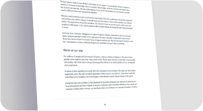 2/24/2018 S-1 Table of Contents How we’ll get there The path to enlightened work starts with creating a better environment. More and more, the work we do every day happens on screens. We believe that these virtual spaces should be as thoughtfully designed as our most inspiring physical spaces. How will Dropbox make this happen? To start, teams need to have all their information in one place. It’s crazy that in 2018, it’s easier to search all of human knowledge than a company’s knowledge—at home we have one search box, but at work we have ten. We see a big opportunity to solve this problem by continuing to tie the world’s different tools and ecosystems together. We also need to design a calm environment that fosters flow. Our workspace should feel organized and surface only what’s relevant. It should tune out the chatter—more communication isn’t always better. The experience should be seamless. You shouldn’t have to use one app to write a doc and another to talk about it. Our newer products like Dropbox Paper are designed with these principles in mind. And over time, machine intelligence will allow Dropbox to better understand both you and your team. Imagine getting to work in the morning to find your calendar reorganized so you have a threehour block of time to actually focus. Imagine starting your day and seeing the perfect todo list—one based on a deep understanding of your priorities and your team’s priorities. We’re on our way For millions of people and businesses, Dropbox is already a living workspace—the place where people come together and their ideas come to life. These users entrust us with their most valuable information. We think this is a huge advantage that will serve as the foundation of our reimagined work experience. Dropbox is also operating at a scale that few companies have achieved. We have over 500 million registered users who store a billion gigabytes of their data on our platform. And we’ve made this costeffective by building one of the largest, most efficient cloud infrastructures in the world. Along the way, we’ve written a new playbook for business software. Our millions of users are our best salespeople and have helped us acquire customers with incredible efficiency. As a result, we reached a billion dollar revenue run rate faster than any softwareasaservice company in history. 90 https://www.sec.gov/Archives/edgar/data/1467623/000119312518055809/d451946ds1.htm 98/235