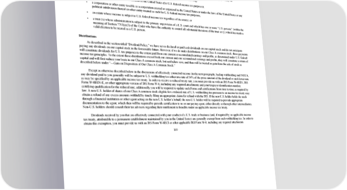 2/24/2018 S-1 Table of Contents You are urged to consult your tax advisor with respect to the application of the U.S. federal income tax laws to your particular situation, as well as any tax consequences of the acquisition, ownership, and disposition of our common stock arising under the U.S. federal estate or gift tax rules, under the laws of any state, local, nonU.S., or other taxing jurisdiction, or under any applicable tax treaty. NonU.S. Holder Defined For purposes of this discussion, you are a nonU.S. holder if you are a holder of our common stock that is not a partnership (or entity or arrangement treated as a partnership for U.S. federal income tax purposes) and is not any of the following: • an individual who is a citizen or resident of the United States (for U.S. federal income tax purposes); • a corporation or other entity taxable as a corporation created or organized in the United States or under the laws of the United States or any political subdivision thereof or other entity treated as such for U.S. federal income tax purposes; • an estate whose income is subject to U.S. federal income tax regardless of its source; or • a trust (x) whose administration is subject to the primary supervision of a U.S. court and which has one or more “U.S. persons” (within the meaning of Section 7701(a)(3) of the Code) who have the authority to control all substantial decisions of the trust or (y) which has made a valid election to be treated as a U.S. person. Distributions As described in the section titled “Dividend Policy,” we have never declared or paid cash dividends on our capital stock and do not anticipate paying any dividends on our capital stock in the foreseeable future. However, if we do make distributions on our Class A common stock, those payments will constitute dividends for U.S. tax purposes to the extent paid from our current or accumulated earnings and profits, as determined under U.S. federal income tax principles. To the extent those distributions exceed both our current and our accumulated earnings and profits, they will constitute a return of capital and will first reduce your basis in our Class A common stock, but not below zero, and then will be treated as gain from the sale of stock as described below under “—Gain on Disposition of Our Class A Common Stock.” Except as otherwise described below in the discussions of effectively connected income (in the next paragraph), backup withholding and FATCA, any dividend paid to you generally will be subject to U.S. withholding tax either at a rate of 30% of the gross amount of the dividend or such lower rate as may be specified by an applicable income tax treaty. In order to receive a reduced treaty rate, you must provide us with an IRS Form W8BEN, IRS Form W8BENE, or other appropriate version of IRS Form W8, including any required attachments and your taxpayer identification number, certifying qualification for the reduced rate; additionally you will be required to update such Forms and certifications from time to time as required by law. A nonU.S. holder of shares of our Class A common stock eligible for a reduced rate of U.S. withholding tax pursuant to an income tax treaty may obtain a refund of any excess amounts withheld by timely filing an appropriate claim for refund with the IRS. If the nonU.S. holder holds the stock through a financial institution or other agent acting on the nonU.S. holder’s behalf, the nonU.S. holder will be required to provide appropriate documentation to the agent, which then will be required to provide certification to us or our paying agent, either directly or through other intermediaries. NonU.S. holders should consult their tax advisors regarding their entitlement to benefits under an applicable income tax treaty. Dividends received by you that are effectively connected with your conduct of a U.S. trade or business (and, if required by an applicable income tax treaty, attributable to a permanent establishment maintained by you in the United States) are generally exempt from such withholding tax. In order to obtain this exemption, you must provide us with an IRS Form W8ECI or other applicable IRS Form W8, including any required attachments 169 https://www.sec.gov/Archives/edgar/data/1467623/000119312518055809/d451946ds1.htm 177/235