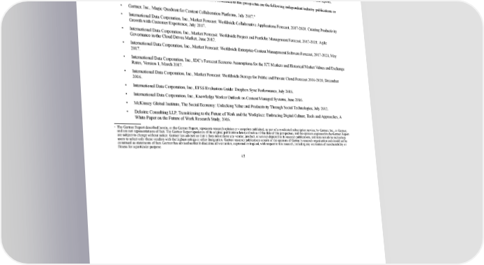 2/24/2018 S-1 Table of Contents INDUSTRY AND MARKET DATA This prospectus contains estimates and information concerning our industry, including market size of the markets in which we participate, that are based on industry publications and reports. This information involves a number of assumptions and limitations, and you are cautioned not to give undue weight to these estimates. We have not independently verified the accuracy or completeness of the data contained in these industry publications and reports. The markets in which we operate are subject to a high degree of uncertainty and risk due to a variety of factors, including those described in the section titled “Risk Factors.” These and other factors could cause results to differ materially from those expressed in these publications and reports. The source of certain statistical data, estimates and forecasts contained in this prospectus are the following independent industry publications or reports: * • Gartner, Inc., Magic Quadrant for Content Collaboration Platforms, July 2017. • International Data Corporation, Inc., Market Forecast: Worldwide Collaborative Applications Forecast, 20172021: Creating Productivity Growth with Customer Experience, July 2017. • International Data Corporation, Inc., Market Forecast: Worldwide Project and Portfolio Management Forecast, 20172021: Agile Governance in the Cloud Drives Market, June 2017. • International Data Corporation, Inc., Market Forecast: Worldwide Enterprise Content Management Software Forecast, 20172021, May 2017. • International Data Corporation, Inc., IDC’s Forecast Scenario Assumptions for the ICT Markets and Historical Market Values and Exchange Rates, Version 1, March 2017. • International Data Corporation, Inc., Market Forecast: Worldwide Storage for Public and Private Cloud Forecast 20162020, December 2016. • International Data Corporation, Inc., EFSS Evaluation Guide: Dropbox Sync Performance, July 2016. • International Data Corporation, Inc., Knowledge Worker Outlook on Content Managed Systems, June 2016. • McKinsey Global Institute, The Social Economy: Unlocking Value and Productivity Through Social Technologies, July 2012. • Deloitte Consulting LLP, Transitioning to the Future of Work and the Workplace: Embracing Digital Culture, Tools and Approaches, A White Paper on the Future of Work Research Study, 2016. * The Gartner Report described herein, or the Gartner Report, represents research opinion or viewpoints published, as part of a syndicated subscription service, by Gartner, Inc., or Gartner, and are not representations of fact. The Gartner Report speaks as of its original publication date (and not as of the date of this prospectus), and the opinions expressed in the Gartner Report are subject to change without notice. Gartner has advised us that it does not endorse any vendor, product, or service depicted in its research publications, and does not advise technology users to select only those vendors with the highest ratings or other designation. Gartner research publications consist of the opinions of Gartner’s research organization and should not be construed as statements of fact. Gartner has advised us that it disclaims all warranties, expressed or implied, with respect to this research, including any warranties of merchantability or fitness for a particular purpose. 45 https://www.sec.gov/Archives/edgar/data/1467623/000119312518055809/d451946ds1.htm 52/235