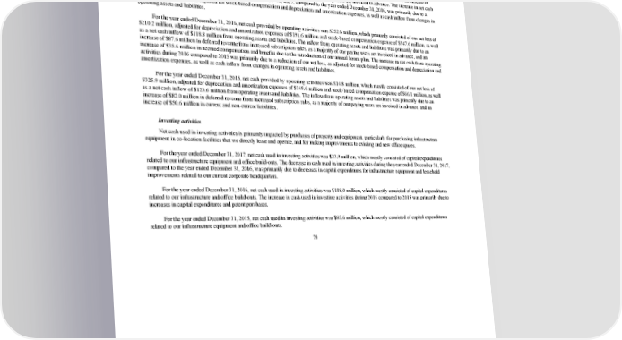 2/24/2018 S-1 Table of Contents infrastructurerelated costs, and marketing expenses. Net cash provided by operating activities is impacted by our net loss adjusted for certain noncash items, including depreciation and amortization expenses and stockbased compensation, as well as the effect of changes in operating assets and liabilities. For the year ended December 31, 2017, net cash provided by operating activities was $330.3 million, which mostly consisted of our net loss of $111.7 million, adjusted for depreciation and amortization expenses of $181.8 million and stockbased compensation expense of $164.6 million, and net cash inflow of $81.3 million from operating assets and liabilities. The inflow from operating assets and liabilities was primarily due to an increase of $64.3 million in deferred revenue from increased subscription sales, as a majority of our paying users are invoiced in advance. The increase in net cash provided by operating activities during the year ended December 31, 2017, compared to the year ended December 31, 2016, was primarily due to a reduction of our net loss, as adjusted for stockbased compensation and depreciation and amortization expenses, as well as cash inflow from changes in operating assets and liabilities. For the year ended December 31, 2016, net cash provided by operating activities was $252.6 million, which primarily consisted of our net loss of $210.2 million, adjusted for depreciation and amortization expenses of $191.6 million and stockbased compensation expense of $147.6 million, as well as a net cash inflow of $118.8 million from operating assets and liabilities. The inflow from operating assets and liabilities was primarily due to an increase of $87.6 million in deferred revenue from increased subscription sales, as a majority of our paying users are invoiced in advance, and an increase of $35.6 million in accrued compensation and benefits due to the introduction of our annual bonus plan. The increase in net cash from operating activities during 2016 compared to 2015 was primarily due to a reduction of our net loss, as adjusted for stockbased compensation and depreciation and amortization expenses, as well as cash inflow from changes in operating assets and liabilities. For the year ended December 31, 2015, net cash provided by operating activities was $14.8 million, which mostly consisted of our net loss of $325.9 million, adjusted for depreciation and amortization expenses of $149.6 million and stockbased compensation expense of $66.1 million, as well as a net cash inflow of $123.6 million from operating assets and liabilities. The inflow from operating assets and liabilities was primarily due to an increase of $82.0 million in deferred revenue from increased subscription sales, as a majority of our paying users are invoiced in advance, and an increase of $50.6 million in current and noncurrent liabilities. Investing activities Net cash used in investing activities is primarily impacted by purchases of property and equipment, particularly for purchasing infrastructure equipment in colocation facilities that we directly lease and operate, and for making improvements to existing and new office spaces. For the year ended December 31, 2017, net cash used in investing activities was $23.9 million, which mostly consisted of capital expenditures related to our infrastructure equipment and office buildouts. The decrease in cash used in investing activities during the year ended December 31, 2017, compared to the year ended December 31, 2016, was primarily due to decreases in capital expenditures for infrastructure equipment and leasehold improvements related to our current corporate headquarters. For the year ended December 31, 2016, net cash used in investing activities was $118.0 million, which mostly consisted of capital expenditures related to our infrastructure and office buildouts. The increase in cash used in investing activities during 2016 compared to 2015 was primarily due to increases in capital expenditures and patent purchases. For the year ended December 31, 2015, net cash used in investing activities was $85.6 million, which mostly consisted of capital expenditures related to our infrastructure equipment and office buildouts. 79 https://www.sec.gov/Archives/edgar/data/1467623/000119312518055809/d451946ds1.htm 87/235