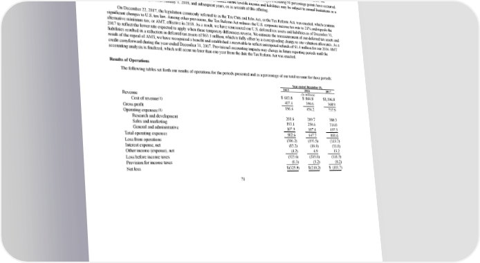 2/24/2018 S-1 Table of Contents for state tax purposes. As of December 31, 2017, we also had $289.3 million of foreign net operating loss carryforwards available to reduce future taxable income, which will carryforward indefinitely. In addition, we had $22.9 million of foreign acquired net operating losses, which will carryforward indefinitely. It is possible that we will not generate taxable income in time to use these net operating loss carryforwards before their expiration. In addition, under Section 382 and 383 of the Internal Revenue Code of 1986, as amended, or the Code, if a corporation undergoes an “ownership change,” the corporation’s ability to use its prechange net operating loss carryforwards and other prechange attributes, such as research tax credits, to offset its postchange income may be limited. In general, an “ownership change” will occur if there is a cumulative change in our ownership by “5percent shareholders” that exceeds 50 percentage points over a rolling threeyear period. Similar rules may apply under state tax laws. We performed a study for the period through December 31, 2017, and determined that no ownership changes exceeding 50 percentage points have occurred. Our ability to use net operating loss and tax credit carryforwards to reduce future taxable income and liabilities may be subject to annual limitations as a result of ownership changes from January 1, 2018, and subsequent years, or as a result of this offering. On December 22, 2017, the legislation commonly referred to as the Tax Cuts and Jobs Act, or the Tax Reform Act, was enacted, which contains significant changes to U.S. tax law. Among other provisions, the Tax Reform Act reduces the U.S. corporate income tax rate to 21% and repeals the alternative minimum tax, or AMT, effective in 2018. As a result, we have remeasured our U.S. deferred tax assets and liabilities as of December 31, 2017 to reflect the lower rate expected to apply when these temporary differences reverse. We estimate the remeasurement of our deferred tax assets and liabilities resulted in a reduction in deferred tax assets of $63.1 million, which is fully offset by a corresponding change to our valuation allowance. As a result of the repeal of AMT, we have recognized a benefit and established a receivable to reflect anticipated refunds of $1.4 million for our 2016 AMT credit carryforward during the year ended December 31, 2017. Provisional accounting impacts may change in future reporting periods until the accounting analysis is finalized, which will occur no later than one year from the date the Tax Reform Act was enacted. Results of Operations The following tables set forth our results of operations for the periods presented and as a percentage of our total revenue for those periods: Year ended December 31, 2015 2016 2017 (In millions) Revenue $ 603.8 $ 844.8 $1,106.8 (1) Cost of revenue 407.4 390.6 368.9 Gross profit 196.4 454.2 737.9 (1) Operating expenses: Research and development 201.6 289.7 380.3 Sales and marketing 193.1 250.6 314.0 General and administrative 107.9 107.4 157.3 Total operating expenses 502.6 647.7 851.6 Loss from operations (306.2) (193.5) (113.7) Interest expense, net (15.2) (16.4) (11.0) Other income (expense), net (4.2) 4.9 13.2 Loss before income taxes (325.6) (205.0) (111.5) Provision for income taxes (0.3) (5.2) (0.2) Net loss $(325.9) $(210.2) $ (111.7) 70 https://www.sec.gov/Archives/edgar/data/1467623/000119312518055809/d451946ds1.htm 78/235