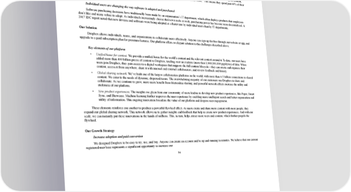 2/24/2018 S-1 Table of Contents that 37% of the global workforce is now mobile, 30% of fulltime employees primarily work remotely, and 20% of the workforce is made up of temporary workers, contractors, and freelancers. The ability to swiftly disseminate content and its relevant context is critical to keeping teams in sync. “Work about work” is wasteful and stifles creativity The combination of scattered content, fragmented tools, and fluid team structures has led to decreased workplace productivity. According to a report by McKinsey & Company, knowledge workers spend approximately 60% of their time at work on tedious tasks such as searching for content, reviewing email, and resharing context to keep team members in the loop—what we call “work about work.” This means they spend just 40% of their time doing the jobs they were hired to do. Individual users are changing the way software is adopted and purchased Software purchasing decisions have traditionally been made by an organization’s IT department, which often deploys products that employees don’t like and many refuse to adopt. As individuals increasingly choose their own tools at work, purchasing power has become more decentralized. A 2017 IDC report noted that new devices and software were being adopted at a faster rate by individual users than by IT departments. Our Solution Dropbox allows individuals, teams, and organizations to collaborate more effectively. Anyone can sign up for free through our website or app, and upgrade to a paid subscription plan for premium features. Our platform offers an elegant solution to the challenges described above. Key elements of our platform • Unified home for content. We provide a unified home for the world’s content and the relevant context around it. To date, our users have added more than 400 billion pieces of content to Dropbox, totaling over an exabyte (more than 1,000,000,000 gigabytes) of data. When users join Dropbox, they gain access to a digital workspace that supports the full content lifecycle—they can create and organize their content, access it from anywhere, share it with internal and external collaborators, and review feedback and history. • Global sharing network. We’ve built one of the largest collaboration platforms in the world, with more than 4.5 billion connections to shared content. We cater to the needs of dynamic, dispersed teams. The overwhelming majority of our customers use Dropbox to share and collaborate. As we continue to grow, more users benefit from frictionless sharing, and powerful network effects increase the utility and stickiness of our platform. • New product experiences. The insights we glean from our community of users lead us to develop new product experiences, like Paper, Smart Sync, and Showcase. Machine learning further improves the user experience by enabling more intelligent search and better organization and utility of information. This ongoing innovation broadens the value of our platform and deepens user engagement. These elements reinforce one another to produce a powerful flywheel effect. As users create and share more content with more people, they expand our global sharing network. This network allows us to gather insights and feedback that help us create new product experiences. And with our scale, we can instantly put these innovations in the hands of millions. This, in turn, helps attract more users and content, which further propels the flywheel. Our Growth Strategy Increase adoption and paid conversion We designed Dropbox to be easy to try, use, and buy. Anyone can create an account and be up and running in minutes. We believe that our current registered user base represents a significant opportunity to increase our 94 https://www.sec.gov/Archives/edgar/data/1467623/000119312518055809/d451946ds1.htm 102/235