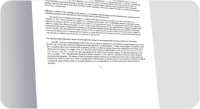 2/24/2018 S-1 Table of Contents controls and procedures and internal control over financial reporting could also cause investors to lose confidence in our reported financial and other information, which would likely have a negative effect on the trading price of our Class A common stock. In addition, if we are unable to continue to meet these requirements, we may not be able to remain listed on Nasdaq. We are not currently required to comply with the SEC rules that implement Section 404 of the SarbanesOxley Act and are therefore not required to make a formal assessment of the effectiveness of our internal control over financial reporting for that purpose. As a public company, we will be required to provide an annual management report on the effectiveness of our internal control over financial reporting commencing with our second annual report on Form 10K. Our independent registered public accounting firm is not required to formally attest to the effectiveness of our internal control over financial reporting until our first annual report filed with the SEC where we are an “accelerated filer” or a “large accelerated filer”. At such time, our independent registered public accounting firm may issue a report that is adverse in the event it is not satisfied with the level at which our internal control over financial reporting is documented, designed, or operating. Any failure to maintain effective disclosure controls and internal control over financial reporting could materially and adversely affect our business, results of operations, and financial condition and could cause a decline in the trading price of our Class A common stock. Although we ceased to be an “emerging growth company,” we can continue to take advantage of certain reduced disclosure requirements in this registration statement, which may make our Class A common stock less attractive to investors. We ceased to be an “emerging growth company,” as defined in the Jumpstart Our Business Startups Act of 2012, or the JOBS Act, on December 31, 2017. However, because we ceased to be an “emerging growth company” after we confidentially submitted our registration statement related to this offering to the SEC, we will continue to be treated as an “emerging growth company” for certain purposes until the earlier of the date on which we complete this offering or December 31, 2018. As such, we have taken advantage of certain reduced disclosure obligations regarding selected financial data and executive compensation arrangements in our registration statement related to this offering that are not available to nonemerging growth companies. We cannot predict if investors will find our Class A common stock less attractive because we have relied on these exemptions. If some investors find our Class A common stock less attractive as a result, there may be less demand for our Class A common stock and the price that some investors are willing to pay for our Class A common stock may decrease. Our reported results of operations may be adversely affected by changes in accounting principles generally accepted in the United States. Generally accepted accounting principles in the United States are subject to interpretation by the Financial Accounting Standards Board, or FASB, the SEC, and various bodies formed to promulgate and interpret appropriate accounting principles. A change in these principles or interpretations could have a significant effect on our reported results of operations, and may even affect the reporting of transactions completed before the announcement or effectiveness of a change. For example, in May 2014, the FASB issued Accounting Standards Update, or ASU, No. 201409, Revenue from Contracts with Customers (Topic 606), or Topic 606, which superseded nearly all existing revenue recognition guidance. We adopted the requirements of Topic 606 as of January 1, 2017, utilizing the full retrospective method of transition. As such, Topic 606 is reflected in our financial results for all periods presented in this prospectus. The adoption of Topic 606 primarily resulted in changes to our accounting policies for revenue recognition and deferred commissions, which we believe to be critical accounting policies. While the impact of adopting Topic 606 on our revenue was not material, it is difficult to predict the impact of future changes to accounting principles or our accounting policies, any of which could negatively affect our results of operations. 34 https://www.sec.gov/Archives/edgar/data/1467623/000119312518055809/d451946ds1.htm 41/235