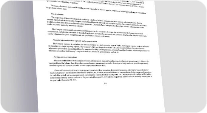 2/24/2018 S-1 Table of Contents The Company’s Board of Directors has approved the acceleration of the Performance Vesting Condition for twotier RSUs for which the service condition was satisfied as of December 31, 2017, to occur upon the effectiveness of its registration statement related to this offering. Accordingly, to satisfy the tax withholding and remittance obligations related to the twotier RSUs, the Company will repurchase the number of shares necessary to satisfy the tax withholding obligations, based on the fair value of its common stock on the date of the initial public offering. The Company currently expects that the average of these withholding tax rates will be approximately 39%. Based upon the assumed initial public offering price of $ per share, which is the midpoint of the estimated offering price range set forth on the cover page of this prospectus, the Company estimates that its tax withholding and remittance obligation would be approximately $ million in the aggregate. Such amount is included as an increase in accrued and other current liabilities and an equivalent decrease in additional paidin capital in the pro forma balance sheet as of December 31, 2017. The unaudited pro forma balance sheet gives effect to the assumed conversion of the twotier RSUs that had satisfied the servicebased vesting condition and the Performance Vesting Condition as of December 31, 2017, and will convert into 23,844,147 shares of Class B common stock, net of 15,244,619 shares repurchased for tax withholding obligations. The shares of common stock issuable and the proceeds expected to be received upon the completion of an initial public offering are excluded from the pro forma balance sheet. Use of estimates The preparation of financial statements in conformity with GAAP requires management to make estimates and assumptions that affect the amounts reported and disclosed in the Company’s consolidated financial statements and accompanying notes. These estimates are based on information available as of the date of the consolidated financial statements. On a regular basis, management evaluates these estimates and assumptions. Actual results may differ materially from these estimates. The Company’s most significant estimates and judgments involve recognition of revenue, the measurement of the Company’s stockbased compensation, including the estimation of the underlying deemed fair value of common stock, the estimation of the fair value of marketbased awards, and the valuation of acquired intangible assets and goodwill from business combinations. Financial information about segments and geographic areas The Company manages its operations and allocates resources as a single operating segment. Further, the Company manages, monitors, and reports its financials as a single reporting segment. The Company’s chief operating decisionmaker is its Chief Executive Officer, who reviews financial information presented on a consolidated basis for purposes of making operating decisions, assessing financial performance, and allocating resources. For information regarding the Company’s longlived assets and revenue by geographic area, see Note 16. Foreign currency transactions The assets and liabilities of the Company’s foreign subsidiaries are translated from their respective functional currencies into U.S. dollars at the rates in effect at the balance sheet date and revenue and expense amounts are translated at the average exchange rate for the period. Foreign currency translation gains and losses are recorded in other comprehensive income (loss). Gains and losses realized from foreign currency transactions (those transactions denominated in currencies other than the foreign subsidiaries’ functional currency) are included in other income (expense), net. Monetary assets and liabilities are remeasured using foreign currency exchange rates at the end of the period, and nonmonetary assets are remeasured based on historical exchange rates. The Company recorded $4.6 million and $3.6 million in net foreign currency transaction losses in the years ended December 31, 2015 and 2016, respectively, and $5.0 million in net foreign currency gains in the year ended December 31, 2017. F9 https://www.sec.gov/Archives/edgar/data/1467623/000119312518055809/d451946ds1.htm 199/235