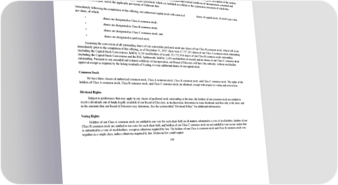 2/24/2018 S-1 Table of Contents DESCRIPTION OF CAPITAL STOCK General The following description summarizes certain important terms of our capital stock, as they are expected to be in effect immediately prior to the completion of this offering. We expect to adopt an amended and restated certificate of incorporation and amended and restated bylaws that will become effective immediately prior to the completion of this offering, and this description summarizes the provisions that are expected to be included in such documents. Because it is only a summary, it does not contain all the information that may be important to you. For a complete description of the matters set forth in this section titled “Description of Capital Stock,” you should refer to our amended and restated certificate of incorporation, amended and restated bylaws and amended and restated investors’ rights agreement, which are included as exhibits to the registration statement of which this prospectus forms a part, and to the applicable provisions of Delaware law. Immediately following the completion of this offering, our authorized capital stock will consist of shares of capital stock, $0.00001 par value per share, of which: • shares are designated as Class A common stock; • shares are designated as Class B common stock; • shares are designated as Class C common stock; and • shares are designated as preferred stock. Assuming the conversion of all outstanding shares of our convertible preferred stock into shares of our Class B common stock, which will occur immediately prior to the completion of this offering, as of December 31, 2017, there were 17,727,212 shares of our Class A common stock outstanding (including the Capital Stock Conversions), held by 1,310 stockholders of record, 522,752,944 shares of our Class B common stock outstanding (including the Capital Stock Conversions and the RSU Settlement), held by 2,658 stockholders of record, and no shares of our Class C common stock outstanding. Pursuant to our amended and restated certificate of incorporation, our Board of Directors will have the authority, without stockholder approval except as required by the listing standards of Nasdaq, to issue additional shares of our capital stock. Common Stock We have three classes of authorized common stock, Class A common stock, Class B common stock, and Class C common stock. The rights of the holders of Class A common stock, Class B common stock, and Class C common stock are identical, except with respect to voting and conversion. Dividend Rights Subject to preferences that may apply to any shares of preferred stock outstanding at the time, the holders of our common stock are entitled to receive dividends out of funds legally available if our Board of Directors, in its discretion, determines to issue dividends and then only at the times and in the amounts that our Board of Directors may determine. See the section titled “Dividend Policy” for additional information. Voting Rights Holders of our Class A common stock are entitled to one vote for each share held on all matters submitted to a vote of stockholders, holders of our Class B common stock are entitled to ten votes for each share held, and holders of our Class C common stock are not entitled to vote on any matter that is submitted to a vote of stockholders, except as otherwise required by law. The holders of our Class A common stock and Class B common stock vote together as a single class, unless otherwise required by law. Delaware law could require 158 https://www.sec.gov/Archives/edgar/data/1467623/000119312518055809/d451946ds1.htm 166/235