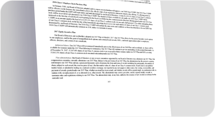 2/24/2018 S-1 Table of Contents Merger or change in control. Our ESPP provides that in the event of a merger or change in control, as defined under our ESPP, a successor corporation may assume or substitute each outstanding purchase right. If the successor corporation refuses to assume or substitute for the outstanding purchase right, the offering period then in progress will be shortened, and a new exercise date will be set that will be before the date of the proposed merger or change in control. The administrator will notify each participant that the exercise date has been changed and that the participant’s option will be exercised automatically on the new exercise date unless prior to such date the participant has withdrawn from the offering period. Amendment; termination. The administrator has the authority to amend, suspend, or terminate our ESPP, except that, subject to certain exceptions described in our ESPP, no such action may adversely affect any outstanding rights to purchase shares of our Class A common stock under our ESPP. Our ESPP automatically will terminate in 2038, unless we terminate it sooner. 2018 Class C Employee Stock Purchase Plan In February 2018, our Board of Directors adopted, and we expect our stockholders will approve, our 2018 Class C ESPP. Our 2018 Class C ESPP will be effective on the business day immediately prior to the effective date of our registration statement related to this offering. No offering period or purchase period under the ESPP will begin unless and until determined by our Board of Directors. A total of 6,205,249 shares of our Class C common stock will be reserved for sale pursuant to our 2018 Class C ESPP. The number of shares available for sale under our 2018 Class C ESPP will be increased on the first day of each fiscal year beginning for the fiscal year following the commencement of the first offering period under our 2018 Class C ESPP, in an amount equal to the least of (i) 6,205,249 shares of our Class C common stock, (ii) one and a half percent (1.5%) of the outstanding shares of our Class C common stock on the last day of the immediately preceding fiscal year or (iii) such number of shares of our Class C common stock determined by our Board of Directors. Our 2018 Class C ESPP will include the same terms and conditions as those described above for our ESPP. Our 2018 Class C ESPP will automatically terminate in 2038, unless we terminate it sooner. 2017 Equity Incentive Plan Our Board of Directors and stockholders adopted our 2017 Plan on March 8, 2017. Our 2017 Plan allows for the grant of incentive stock options to our employees, and for the grant of nonqualified stock options and restricted stock awards, RSUs, and stock appreciation rights to employees, officers, directors, and certain of our consultants. Authorized shares. Our 2017 Plan will be terminated immediately prior to the effectiveness of our 2018 Plan, and accordingly, no shares will be available for issuance under the 2017 Plan following its termination. Our 2017 Plan will continue to govern outstanding awards granted thereunder. As of December 31, 2017, 13,467,085 shares of our Class A common stock were reserved for future issuance under our 2017 Plan and RSUs covering 25,061,536 shares of our Class A common stock remained outstanding under our 2017 Plan. Plan administration. Our Board of Directors or one or more committees appointed by our Board of Directors may administer our 2017 Plan. Our compensation committee currently administers our 2017 Plan. Subject to the provisions of our 2017 Plan, the administrator has the power to construe and interpret our 2017 Plan and any agreement thereunder and to determine the form and terms of awards (including the participants), the number of shares subject to each award, the exercise price (if any), the fair market value of a share of our Class A common stock, if such stock is not publicly traded, listed, or admitted to trading on a national securities exchange, nor reported in any newspaper or other source, the vesting, exercisability, and payment of awards granted under our 2017 Plan, whether an award has been earned, and whether awards will be granted singly, in combination with, in tandem with, in replacement of, or as alternatives to, other awards. The administrator may correct, prescribe, amend, expand, modify, rescind, or terminate rules and regulations relating to our 2017 Plan. The administrator may, at any time, authorize the issuance of new awards in exchange for the surrender and 145 https://www.sec.gov/Archives/edgar/data/1467623/000119312518055809/d451946ds1.htm 153/235
