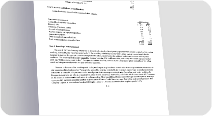 2/24/2018 S-1 Table of Contents Note 7. Goodwill Goodwill represents the excess of the purchase price in a business combination over the fair value of net tangible and intangible assets acquired. Goodwill amounts are not amortized, but tested for impairment on an annual basis. There was no impairment of goodwill as of December 31, 2016 and 2017. Goodwill consisted of the following: Balance at December 31, 2015 96.1 Effect of foreign currency translation (0.1) Balance at December 31, 2016 96.0 Effect of foreign currency translation 2.9 Balance at December 31, 2017 $98.9 Note 8. Accrued and Other Current Liabilities Accrued and other current liabilities consisted of the following: As of December 31, 2016 2017 Nonincome taxes payable $ 49.4 $ 69.7 Accrued legal and other external fees 11.9 21.3 Deferred rent 11.0 14.6 Financing obligations, current 11.4 9.7 Accrued infrastructure costs 1.9 2.6 Accrued property and equipment purchases 5.8 1.8 Income taxes payable 2.2 0.4 Other accrued and current liabilities 4.3 9.7 Total accrued and other current liabilities $ 97.9 $129.8 Note 9. Revolving Credit Agreement On April 3, 2017, the Company entered into an amended and restated credit and guaranty agreement which currently provides for a $600.0 million revolving loan facility (the “revolving credit facility”). The revolving credit facility has an accordion option, which, if exercised, would allow the Company to increase the aggregate commitments up to $150.0 million, subject to obtaining additional lender commitments and satisfying certain conditions. The revolving credit facility replaced the Company’s existing $500.0 million revolving credit facility that was set to expire on March 20, 2018 (the “2014 revolving credit facility”). In conjunction with the revolving credit facility, the Company paid upfront issuance fees of $2.6 million, which are being amortized over the fiveyear term of the agreement. Pursuant to the terms of the revolving credit facility, the Company may issue letters of credit under the revolving credit facility, which reduce the total amount available for borrowing. Pursuant to the terms of the revolving credit facility, the Company is required to pay an annual commitment fee that accrues at a rate of 0.20% per annum on the unused portion of the borrowing commitments under the revolving credit facility. In addition, the Company is required to pay a fee in connection with letters of credit issued under the revolving credit facility, which accrues at a rate of 1.5% per annum on the amount to be drawn under such letters of credit outstanding. There is an additional fronting fee of 0.125% per annum multiplied by the average aggregate daily maximum amount available to be drawn under all letters of credit. Borrowings under the revolving credit facility bear interest, at the Company’s option, at an annual rate based on LIBOR plus a spread of 1.50% or at an alternative base rate plus a spread of 0.50%. F22 https://www.sec.gov/Archives/edgar/data/1467623/000119312518055809/d451946ds1.htm 212/235