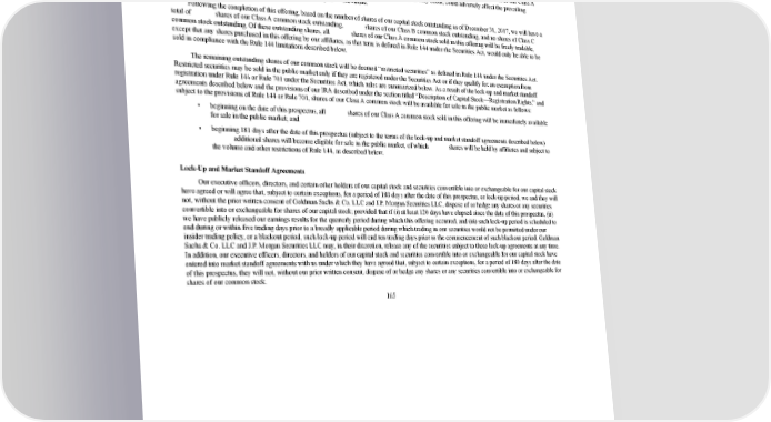 2/24/2018 S-1 Table of Contents SHARES ELIGIBLE FOR FUTURE SALE Prior to this offering, there has been no public market for our Class A common stock, and we cannot predict the effect, if any, that market sales of shares of our Class A common stock or the availability of shares of our Class A common stock for sale will have on the market price of our Class A common stock prevailing from time to time. Future sales of our common stock in the public market, or the availability of such shares for sale in the public market, could adversely affect market prices prevailing from time to time. As described below, only a limited number of shares of our Class A common stock will be available for sale shortly after this offering due to contractual and legal restrictions on resale. Nevertheless, sales of our Class A common stock in the public market after such restrictions lapse, or the perception that those sales may occur, could adversely affect the prevailing market price at such time and our ability to raise equity capital in the future. Following the completion of this offering, based on the number of shares of our capital stock outstanding as of December 31, 2017, we will have a total of shares of our Class A common stock outstanding, shares of our Class B common stock outstanding, and no shares of Class C common stock outstanding. Of these outstanding shares, all shares of our Class A common stock sold in this offering will be freely tradable, except that any shares purchased in this offering by our affiliates, as that term is defined in Rule 144 under the Securities Act, would only be able to be sold in compliance with the Rule 144 limitations described below. The remaining outstanding shares of our common stock will be deemed “restricted securities” as defined in Rule 144 under the Securities Act. Restricted securities may be sold in the public market only if they are registered under the Securities Act or if they qualify for an exemption from registration under Rule 144 or Rule 701 under the Securities Act, which rules are summarized below. As a result of the lockup and market standoff agreements described below and the provisions of our IRA described under the section titled “Description of Capital Stock—Registration Rights,” and subject to the provisions of Rule 144 or Rule 701, shares of our Class A common stock will be available for sale in the public market as follows: • beginning on the date of this prospectus, all shares of our Class A common stock sold in this offering will be immediately available for sale in the public market; and • beginning 181 days after the date of this prospectus (subject to the terms of the lockup and market standoff agreements described below) additional shares will become eligible for sale in the public market, of which shares will be held by affiliates and subject to the volume and other restrictions of Rule 144, as described below. LockUp and Market Standoff Agreements Our executive officers, directors, and certain other holders of our capital stock and securities convertible into or exchangeable for our capital stock have agreed or will agree that, subject to certain exceptions, for a period of 180 days after the date of this prospectus, or lockup period, we and they will not, without the prior written consent of Goldman Sachs & Co. LLC and J.P. Morgan Securities LLC, dispose of or hedge any shares or any securities convertible into or exchangeable for shares of our capital stock; provided that if (i) at least 120 days have elapsed since the date of this prospectus, (ii) we have publicly released our earnings results for the quarterly period during which this offering occurred, and (iii) such lockup period is scheduled to end during or within five trading days prior to a broadly applicable period during which trading in our securities would not be permitted under our insider trading policy, or a blackout period, such lockup period will end ten trading days prior to the commencement of such blackout period. Goldman Sachs & Co. LLC and J.P. Morgan Securities LLC may, in their discretion, release any of the securities subject to these lockup agreements at any time. In addition, our executive officers, directors, and holders of our capital stock and securities convertible into or exchangeable for our capital stock have entered into market standoff agreements with us under which they have agreed that, subject to certain exceptions, for a period of 180 days after the date of this prospectus, they will not, without our prior written consent, dispose of or hedge any shares or any securities convertible into or exchangeable for shares of our common stock. 165 https://www.sec.gov/Archives/edgar/data/1467623/000119312518055809/d451946ds1.htm 173/235