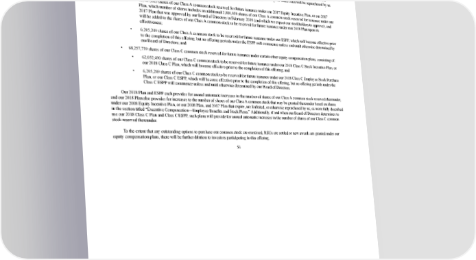 2/24/2018 S-1 Table of Contents • 25,061,536 shares of our Class A common stock and 18,240,237 shares of our Class B common stock subject to RSUs outstanding, but for which the service condition was not satisfied, as of December 31, 2017; • 14,865,820 shares of our Class A common stock subject to RSUs granted after December 31, 2017; • 98,969,443 shares of our Class A common stock reserved for future issuance under our equity compensation plans, consisting of: • 77,297,109 shares of our Class A common stock to be reserved for future issuance under our 2018 Equity Incentive Plan, or our 2018 Plan, which will become effective prior to the completion of this offering (including the shares that will be repurchased by us in connection with the RSU Settlement); • 15,467,085 shares of our Class A common stock reserved for future issuance under our 2017 Equity Incentive Plan, or our 2017 Plan, which number of shares includes an additional 2,000,000 shares of our Class A common stock reserved for issuance under our 2017 Plan that was approved by our Board of Directors in February 2018 (and which we expect our stockholders to approve), and will be added to the shares of our Class A common stock to be reserved for future issuance under our 2018 Plan upon its effectiveness; • 6,205,249 shares of our Class A common stock to be reserved for future issuance under our ESPP, which will become effective prior to the completion of this offering, but no offering periods under the ESPP will commence unless and until otherwise determined by our Board of Directors; and • 68,257,739 shares of our Class C common stock reserved for future issuance under certain other equity compensation plans, consisting of: • 62,052,490 shares of our Class C common stock to be reserved for future issuance under our 2018 Class C Stock Incentive Plan, or our 2018 Class C Plan, which will become effective prior to the completion of this offering; and • 6,205,249 shares of our Class C common stock to be reserved for future issuance under our 2018 Class C Employee Stock Purchase Plan, or our Class C ESPP, which will become effective prior to the completion of this offering, but no offering periods under the Class C ESPP will commence unless and until otherwise determined by our Board of Directors. Our 2018 Plan and ESPP each provides for annual automatic increases in the number of shares of our Class A common stock reserved thereunder, and our 2018 Plan also provides for increases to the number of shares of our Class A common stock that may be granted thereunder based on shares under our 2008 Equity Incentive Plan, or our 2008 Plan, and 2017 Plan that expire, are forfeited, or otherwise repurchased by us, as more fully described in the section titled “Executive Compensation—Employee Benefits and Stock Plans.” Additionally, if and when our Board of Directors determines to use our 2018 Class C Plan and Class C ESPP, such plans will provide for annual automatic increases in the number of shares of our Class C common stock reserved thereunder. To the extent that any outstanding options to purchase our common stock are exercised, RSUs are settled or new awards are granted under our equity compensation plans, there will be further dilution to investors participating in this offering. 54 https://www.sec.gov/Archives/edgar/data/1467623/000119312518055809/d451946ds1.htm 61/235