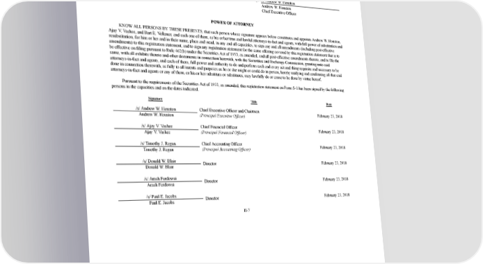2/24/2018 S-1 Table of Contents SIGNATURES Pursuant to the requirements of the Securities Act of 1933, as amended, the Registrant has duly caused this registration statement on Form S1 to be signed on its behalf by the undersigned, thereunto duly authorized, in San Francisco, California, on the 23rd day of February, 2018. DROPBOX, INC. By: /s/ Andrew W. Houston Andrew W. Houston Chief Executive Officer POWER OF ATTORNEY KNOW ALL PERSONS BY THESE PRESENTS, that each person whose signature appears below constitutes and appoints Andrew W. Houston, Ajay V. Vashee, and Bart E. Volkmer, and each one of them, as his or her true and lawful attorneysinfact and agents, with full power of substitution and resubstitution, for him or her and in their name, place and stead, in any and all capacities, to sign any and all amendments (including posteffective amendments) to this registration statement, and to sign any registration statement for the same offering covered by this registration statement that is to be effective on filing pursuant to Rule 462(b) under the Securities Act of 1933, as amended, and all posteffective amendments thereto, and to file the same, with all exhibits thereto and other documents in connection herewith, with the Securities and Exchange Commission, granting unto said attorneysinfact and agents, and each of them, full power and authority to do and perform each and every act and thing requisite and necessary to be done in connection therewith, as fully to all intents and purposes as he or she might or could do in person, hereby ratifying and confirming all that said attorneysinfact and agents or any of them, or his or her substitute or substitutes, may lawfully do or cause to be done by virtue hereof. Pursuant to the requirements of the Securities Act of 1933, as amended, this registration statement on Form S1 has been signed by the following persons in the capacities and on the dates indicated. Signature Title Date /s/ Andrew W. Houston Chief Executive Officer and Chairman February 23, 2018 (Principal Executive Officer) Andrew W. Houston /s/ Ajay V. Vashee Chief Financial Officer February 23, 2018 (Principal Financial Officer) Ajay V. Vashee /s/ Timothy J. Regan Chief Accounting Officer February 23, 2018 (Principal Accounting Officer) Timothy J. Regan /s/ Donald W. Blair Director February 23, 2018 Donald W. Blair /s/ Arash Ferdowsi Director February 23, 2018 Arash Ferdowsi /s/ Paul E. Jacobs Director February 23, 2018 Paul E. Jacobs II7 https://www.sec.gov/Archives/edgar/data/1467623/000119312518055809/d451946ds1.htm 234/235