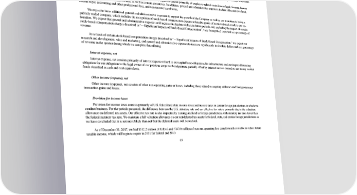 2/24/2018 S-1 Table of Contents obtaining a contract with a user, are deferred and amortized over an estimated period of benefit of five years. Additionally, sales and marketing expenses include nonemployee costs related to app store fees and fees payable to thirdparty sales representatives. We plan to continue to invest in sales and marketing to grow our user base and increase our brand awareness, including marketing efforts to continue to drive our selfserve business model. The trend and timing of sales and marketing expenses will depend in part on the timing of marketing campaigns. We expect that sales and marketing expenses will increase in absolute dollars in future periods and, excluding the impact of certain stock based compensation charges described in “—Significant Impacts of StockBased Compensation”, vary from period to period as a percentage of revenue. General and administrative. Our general and administrative expenses consist primarily of employeerelated costs for our legal, finance, human resources, and other administrative teams, as well as certain executives. In addition, general and administrative expenses include allocated overhead, outside legal, accounting and other professional fees, and nonincome based taxes. We expect to incur additional general and administrative expenses to support the growth of the Company as well as our transition to being a publicly traded company, which includes the recognition of stockbased compensation expense related to grants of restricted stock made to our co founders. We expect that general and administrative expenses will increase in absolute dollars in future periods and, excluding the impact of certain stockbased compensation charges described in “—Significant Impacts of StockBased Compensation”, vary from period to period as a percentage of revenue. As a result of certain stockbased compensation charges described in “—Significant Impacts of StockBased Compensation,” we expect our research and development, sales and marketing, and general and administrative expenses to increase significantly in absolute dollars and as a percentage of revenue in the quarter during which we complete this offering. Interest expense, net Interest expense, net consists primarily of interest expense related to our capital lease obligations for infrastructure and our imputed financing obligation for our obligation to the legal owner of our previous corporate headquarters, partially offset by interest income earned on our money market funds classified as cash and cash equivalents. Other income (expense), net Other income (expense), net consists of other nonoperating gains or losses, including those related to ongoing subleases and foreign currency transaction gains and losses. Provision for income taxes Provision for income taxes consists primarily of U.S. federal and state income taxes and income taxes in certain foreign jurisdictions in which we conduct business. For the periods presented, the difference between the U.S. statutory rate and our effective tax rate is primarily due to the valuation allowance on deferred tax assets. Our effective tax rate is also impacted by earnings realized in foreign jurisdictions with statutory tax rates lower than the federal statutory tax rate. We maintain a full valuation allowance on our net deferred tax assets for federal, state, and certain foreign jurisdictions as we have concluded that it is not more likely than not that the deferred assets will be realized. As of December 31, 2017, we had $312.2 million of federal and $143.0 million of state net operating loss carryforwards available to reduce future taxable income, which will begin to expire in 2031 for federal and 2030 69 https://www.sec.gov/Archives/edgar/data/1467623/000119312518055809/d451946ds1.htm 77/235