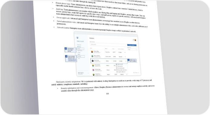 2/24/2018 S-1 Table of Contents servers, Dropbox uses Secure Sockets Layer, or SSL, and Transport Layer Security, or TLS, for data transfer, creating a secure tunnel protected by 128bit or higher AES encryption. • File recovery. Every deletion event in Dropbox is recorded, including when groups of files are deleted. Users can easily recover files through our web interface. Dropbox Plus subscribers may recover prior versions for up to 30 days after deletion, and Dropbox Professional and Dropbox Business subscribers may recover prior versions for up to 120 days after deletion. Administrator controls. Dropbox Business team administrators have many ways to customize security settings in both global and granular ways. • Sharing permissions: Team administrators can set up and monitor how their members share team folders, and can set sharing permissions on all folders, subfolders, and links through the sharing tab. • Remote device wipe: Team administrators can delete their organization’s Dropbox content from a member’s linked devices, which is especially useful should someone lose a device or leave the team. • Audit log: Team administrators can monitor which members are sharing files and logging into Dropbox, among other events. They can review activity logs, create full reports for specific time ranges, and pull activity reports on specific members. Advanced and Enterprise team administrators have access to audit logs with fileevent tracking. • Device approvals: Advanced and Enterprise team administrators can manage how members access Dropbox on their devices. • Tiered administrator roles: Advanced and Enterprise teams have the ability to set multiple administrator roles, each with a different set of permissions. • Network control: Enterprise team administrators can restrict personal Dropbox usage on their organization’s network. Thirdparty security integrations. We’ve partnered with industryleading third parties to enable us to provide a wide range of IT processes and satisfy industry compliance standards, including: • Security information and event management: Allows Dropbox Business administrators to oversee and manage employee activity, and access sensitive data through the administrator page. 104 https://www.sec.gov/Archives/edgar/data/1467623/000119312518055809/d451946ds1.htm 112/235