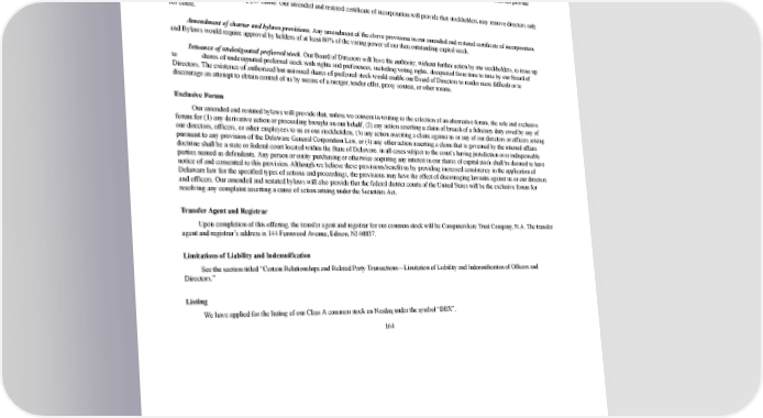 2/24/2018 S-1 Table of Contents content of a stockholder’s notice. These provisions might preclude our stockholders from bringing matters before our annual meeting of stockholders or from making nominations for directors at our annual meeting of stockholders if the proper procedures are not followed. We expect that these provisions may also discourage or deter a potential acquirer from conducting a solicitation of proxies to elect the acquirer’s own slate of directors or otherwise attempting to obtain control of our company. No cumulative voting. The Delaware General Corporation Law provides that stockholders are not entitled to cumulate votes in the election of directors unless a corporation’s certificate of incorporation provides otherwise. Our amended and restated certificate of incorporation does not provide for cumulative voting. Directors removed only for cause. Our amended and restated certificate of incorporation will provide that stockholders may remove directors only for cause. Amendment of charter and bylaws provisions. Any amendment of the above provisions in our amended and restated certificate of incorporation and Bylaws would require approval by holders of at least 80% of the voting power of our then outstanding capital stock. Issuance of undesignated preferred stock. Our Board of Directors will have the authority, without further action by our stockholders, to issue up to shares of undesignated preferred stock with rights and preferences, including voting rights, designated from time to time by our Board of Directors. The existence of authorized but unissued shares of preferred stock would enable our Board of Directors to render more difficult or to discourage an attempt to obtain control of us by means of a merger, tender offer, proxy contest, or other means. Exclusive Forum Our amended and restated bylaws will provide that, unless we consent in writing to the selection of an alternative forum, the sole and exclusive forum for (1) any derivative action or proceeding brought on our behalf, (2) any action asserting a claim of breach of a fiduciary duty owed by any of our directors, officers, or other employees to us or our stockholders, (3) any action asserting a claim against us or any of our directors or officers arising pursuant to any provision of the Delaware General Corporation Law, or (4) any other action asserting a claim that is governed by the internal affairs doctrine shall be a state or federal court located within the State of Delaware, in all cases subject to the court’s having jurisdiction over indispensable parties named as defendants. Any person or entity purchasing or otherwise acquiring any interest in our shares of capital stock shall be deemed to have notice of and consented to this provision. Although we believe these provisions benefit us by providing increased consistency in the application of Delaware law for the specified types of actions and proceedings, the provisions may have the effect of discouraging lawsuits against us or our directors and officers. Our amended and restated bylaws will also provide that the federal district courts of the United States will be the exclusive forum for resolving any complaint asserting a cause of action arising under the Securities Act. Transfer Agent and Registrar Upon completion of this offering, the transfer agent and registrar for our common stock will be Computershare Trust Company, N.A. The transfer agent and registrar’s address is 144 Fernwood Avenue, Edison, NJ 08837. Limitations of Liability and Indemnification See the section titled “Certain Relationships and Related Party Transactions—Limitation of Liability and Indemnification of Officers and Directors.” Listing We have applied for the listing of our Class A common stock on Nasdaq under the symbol “DBX”. 164 https://www.sec.gov/Archives/edgar/data/1467623/000119312518055809/d451946ds1.htm 172/235