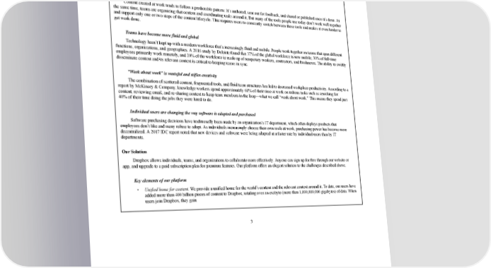 2/24/2018 S-1 Table of Contents Industry Trends in Our Favor Content is increasingly scattered The proliferation of devices, operating systems, and applications has dramatically increased the volume and complexity of content in the workplace. Content is now routinely scattered across multiple silos, making it harder to access. According to a 2016 IDC report, more than half of companies ranging from 100 to 5,000+ employees use at least three repositories for accessing documents on a weekly basis. The tools people use are fragmented Content created at work tends to follow a predictable pattern: It’s authored, sent out for feedback, and shared or published once it’s done. At the same time, teams are organizing that content and coordinating tasks around it. But many of the tools people use today don’t work well together and support only one or two steps of the content lifecycle. This requires users to constantly switch between these tools and makes it even harder to get work done. Teams have become more fluid and global Technology hasn’t kept up with a modern workforce that’s increasingly fluid and mobile. People work together on teams that span different functions, organizations, and geographies. A 2016 study by Deloitte found that 37% of the global workforce is now mobile, 30% of fulltime employees primarily work remotely, and 20% of the workforce is made up of temporary workers, contractors, and freelancers. The ability to swiftly disseminate content and its relevant context is critical to keeping teams in sync. “Work about work” is wasteful and stifles creativity The combination of scattered content, fragmented tools, and fluid team structures has led to decreased workplace productivity. According to a report by McKinsey & Company, knowledge workers spend approximately 60% of their time at work on tedious tasks such as searching for content, reviewing email, and resharing context to keep team members in the loop—what we call “work about work.” This means they spend just 40% of their time doing the jobs they were hired to do. Individual users are changing the way software is adopted and purchased Software purchasing decisions have traditionally been made by an organization’s IT department, which often deploys products that employees don’t like and many refuse to adopt. As individuals increasingly choose their own tools at work, purchasing power has become more decentralized. A 2017 IDC report noted that new devices and software were being adopted at a faster rate by individual users than by IT departments. Our Solution Dropbox allows individuals, teams, and organizations to collaborate more effectively. Anyone can sign up for free through our website or app, and upgrade to a paid subscription plan for premium features. Our platform offers an elegant solution to the challenges described above. Key elements of our platform • Unified home for content. We provide a unified home for the world’s content and the relevant context around it. To date, our users have added more than 400 billion pieces of content to Dropbox, totaling over an exabyte (more than 1,000,000,000 gigabytes) of data. When users join Dropbox, they gain 3 https://www.sec.gov/Archives/edgar/data/1467623/000119312518055809/d451946ds1.htm 10/235