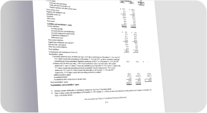 2/24/2018 S-1 Table of Contents DROPBOX, INC. CONSOLIDATED BALANCE SHEETS (In millions, except for par value) Pro forma stockholders’ equity as of As of December 31, December 31, 2016 2017 2017 (unaudited) Assets Current assets: Cash and cash equivalents $ 352.7 $ 430.0 Trade and other receivables, net 13.2 29.3 Prepaid expenses and other current assets 47.5 58.8 Total current assets 413.4 518.1 Property and equipment, net 444.0 341.9 Intangible assets, net 24.2 17.0 Goodwill 96.0 98.9 Other assets 26.6 44.0 Total assets $1,004.2 $ 1,019.9 Liabilities and stockholders’ equity Current liabilities: Accounts payable $ 15.5 $ 31.9 Accrued and other current liabilities 97.9 129.8 Accrued compensation and benefits 41.3 56.1 (1) Capital lease obligation 127.6 102.7 Deferred revenue 353.0 417.9 Total current liabilities 635.3 738.4 (1) Capital lease obligation, noncurrent 129.6 71.6 Deferred rent, noncurrent 72.5 69.8 Other noncurrent liabilities 44.0 37.2 Total liabilities 881.4 917.0 Commitments and contingencies (Note 10) Stockholders’ equity: Convertible preferred stock, $0.00001 par value; 226.8 shares authorized as of December 31, 2016 and 2017; 221.4 shares issued and outstanding as of December 31, 2016 and 2017; no shares authorized, issued and outstanding pro forma (unaudited); liquidation preference of $624.7 as of December 31, 2016 and 2017 615.3 615.3 $ — Common stock $0.00001 par value; 1,500.0 shares authorized; Class A common stock 800.0 shares (2) authorized; 8.3 and 13.4 shares issued and outstanding as of December 31, 2016 and 2017, respectively; 17.7 shares issued and outstanding pro forma (unaudited); Class B common stock 700.0 shares authorized, 272.5 and 281.9 shares issued and outstanding as of December 31, 2016 and 2017, respectively; 522.8 shares issued and outstanding pro forma (unaudited) — — — Additional paidin capital 446.0 533.1 1,564.0 Accumulated deficit (937.5) (1,049.7) (1,465.3) Accumulated other comprehensive income (loss) (1.0) 4.2 4.2 Total stockholders’ equity 122.8 102.9 $ 102.9 Total liabilities and stockholders’ equity $1,004.2 $ 1,019.9 (1) Includes amounts attributable to related party transactions. See Note 15 for further details. (2) Class A shares issued and outstanding as of December 31, 2017 exclude 22.1 million unvested restricted stock awards granted to the Company’s cofounders. See Note 11 for further details. See accompanying Notes to Consolidated Financial Statements. F3 https://www.sec.gov/Archives/edgar/data/1467623/000119312518055809/d451946ds1.htm 193/235