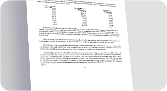 2/24/2018 S-1 Table of Contents CoFounder Grants In December 2017, the Board of Directors approved a grant to our cofounders of restricted stock awards, or RSAs, with respect to 22.1 million shares of Class A Common Stock in the aggregate, or collectively, the CoFounder Grants, of which 15.5 million RSAs were granted to Mr. Houston, the Company’s cofounder and Chief Executive Officer, and 6.6 million RSAs were granted to Mr. Ferdowsi, the Company’s cofounder and Director. These CoFounder Grants have servicebased, marketbased, and performancebased vesting conditions. While the CoFounder Grants have certain stockholder rights, such as the right to vote the shares with the other holders of our Class A common stock, the CoFounder Grants will be excluded from Class A common stock issued and outstanding until the satisfaction of these vesting conditions. The CoFounder Grants are eligible to vest over the tenyear period following the closing of this offering. The CoFounder Grants comprise nine tranches that are eligible to vest based on the achievement of stock price goals, or, each, a Stock Price Target, measured over a consecutive thirtyday trading period during the Performance Period, as follows: Company Stock Price Shares Eligible to Vest for Shares Eligible to Vest Target Mr. Houston for Mr. Ferdowsi $20.00 3,100,000 1,320,000 $25.00 1,550,000 660,000 $30.00 1,550,000 660,000 $35.00 1,550,000 660,000 $40.00 1,550,000 660,000 $45.00 1,550,000 660,000 $50.00 1,550,000 660,000 $55.00 1,550,000 660,000 $60.00 1,550,000 660,000 The Performance Period begins on the first trading day following the later of (a) the expiration of the lockup period following the first date the Company’s shares are traded on an established national securities exchange or automated quotation system, or the IPO Date, and (b) January 1, 2019, and ends on the earliest to occur of: (i) the date on which all shares subject to the CoFounder Grants vest, (ii) the date the applicable cofounder ceases to satisfy the servicebased vesting condition, (iii) the tenth anniversary of the IPO Date, and (iv) the occurrence of an acquisition of the Company prior to the IPO Date. During the first four years of the Performance Period, no more than 20% of the shares subject to each CoFounder Grant would be eligible to vest in any calendar year. After the first four years, all shares are eligible to vest based on the achievement of the Company Stock Price Targets. The CoFounder Grants contain an implied performancebased vesting condition satisfied upon the IPO Date, because no shares subject to the Co Founder Grants will vest unless the IPO Date occurs. Accordingly, as of December 31, 2017, all compensation expense related to the CoFounder Grants remained unrecognized because the performancebased vesting condition was not deemed probable of being achieved. We estimated the grant date fair value of the CoFounder Grants using a model based on multiple stock price paths developed through the use of a Monte Carlo simulation that incorporates into the valuation the possibility that the Stock Price Targets may not be satisfied. The average grant date fair value of each CoFounder Grant was estimated to be $7.07 per share, and we will recognize total stockbased compensation expense of $156.2 million over the requisite service period of each tranche, which ranged from 2.9 to 6.9 years, using the accelerated attribution method. If the Stock Price Targets are met sooner than the derived service period, we will adjust our stockbased compensation to reflect the cumulative expense associated with the vested awards. We will recognize stockbased compensation expense if the requisite service period is provided, regardless of whether the market conditions are achieved. 82 https://www.sec.gov/Archives/edgar/data/1467623/000119312518055809/d451946ds1.htm 90/235